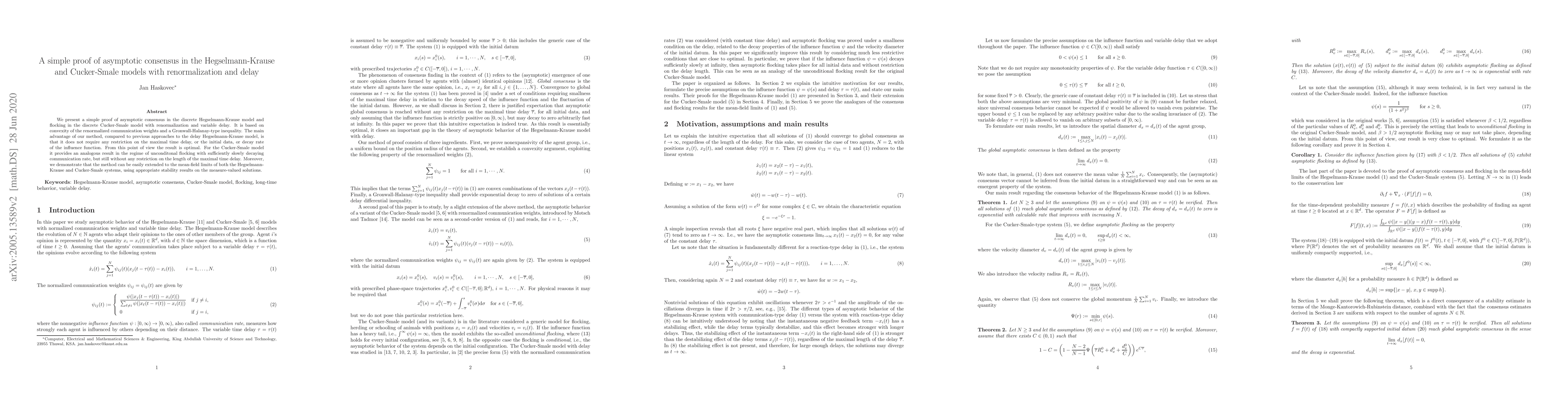 We present a simple proof of asymptotic consensus in the discrete Hegselmann-Krause model and flocking in the discrete Cucker-Smale model with renormalization and variable delay. It is based on convexity of the renormalized communication weights and a Gronwall-Halanay-type inequality. The main advantage of our method, compared to previous approaches to the delay Hegselmann-Krause model, is that it does not require any restriction on the maximal time delay, or the initial data, or decay rate of the influence function. From this point of view the result is optimal. For the Cucker-Smale model it provides an analogous result in the regime of unconditonal flocking with sufficiently slowly decaying communication rate, but still without any restriction on the length of the maximal time delay. Moreover, we demonstrate that the method can be easily extended to the mean-field limits of both the Hegselmann-Krause and Cucker-Smale systems, using appropriate stability results on the measure-valued solutions.