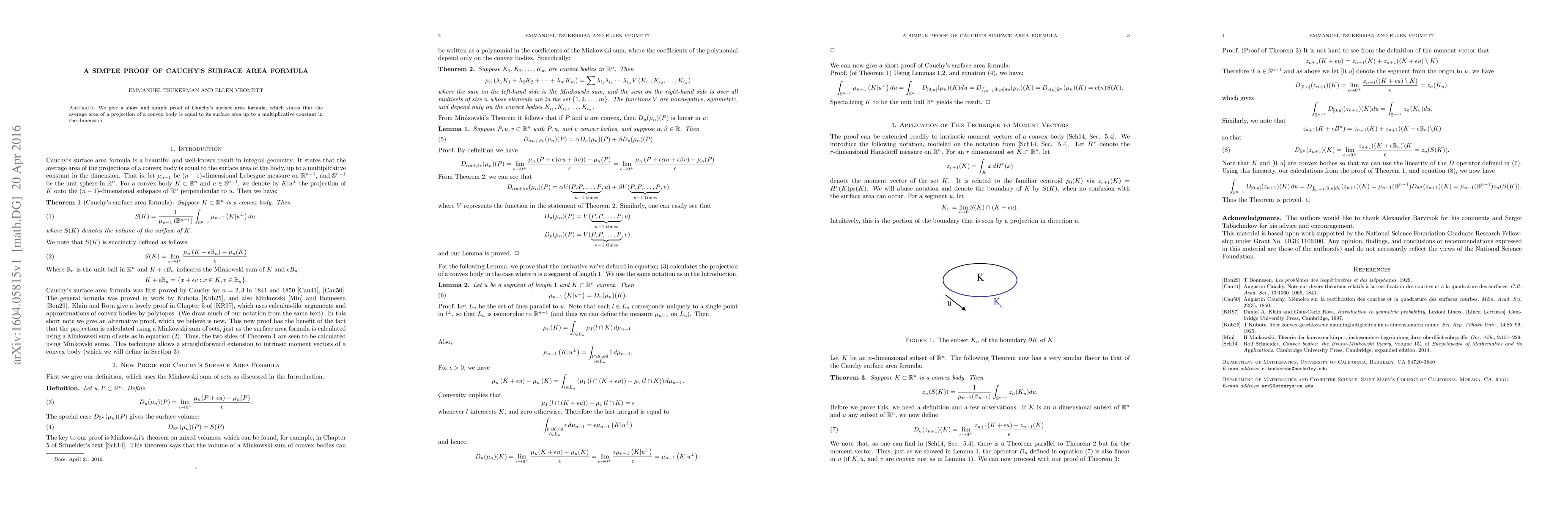 Summary: This paper presents an easy-to-follow proof of Cauchy's surface area formula, demonstrating that the average projected area of a convex body equals its surface area, scaled by a constant dependent on the dimension.