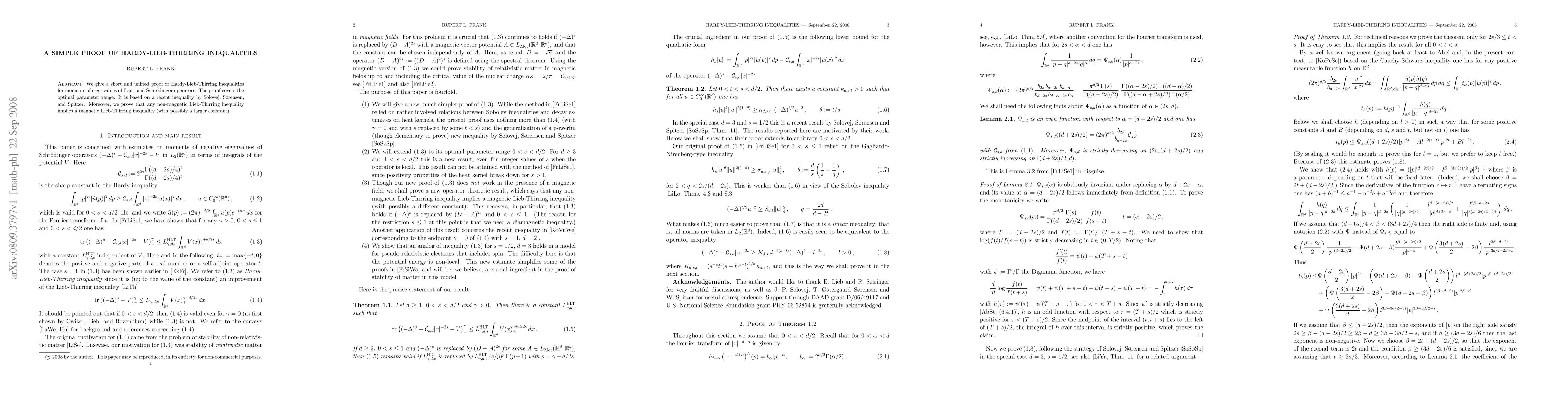 We give a short and unified proof of Hardy-Lieb-Thirring inequalities for moments of eigenvalues of fractional Schroedinger operators. The proof covers the optimal parameter range. It is based on a recent inequality by Solovej, Soerensen, and Spitzer. Moreover, we prove that any non-magnetic Lieb-Thirring inequality implies a magnetic Lieb-Thirring inequality (with possibly a larger constant).