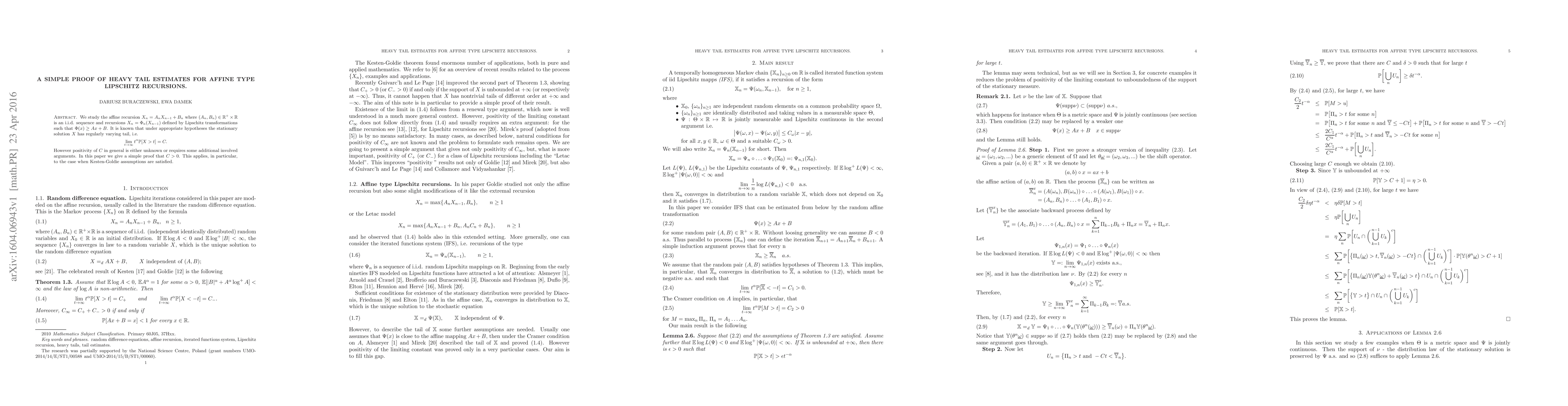 We study the affine recursion $X_n = A_nX_{n-1}+B_n$ where $(A_n,B_n)\in {\mathbb R}^+ \times {\mathbb R} $ is an i.i.d. sequence and recursions $X_n = \Phi_n(X_{n-1})$ defined by Lipschitz transformations such that $\Phi (x)\geq Ax+B$. It is known that under appropriate hypotheses the stationary solution $X$ has regularly varying tail, i.e. $$\lim_{t\to\infty} t^{\alpha} {\mathbb P}[X>t] = C. $$ However positivity of $C$ in general is either unknown or requires some additional involved arguments. In this paper we give a simple proof that $C>0$. This applies, in particular, to the case when Kesten-Goldie assumptions are satisfied.