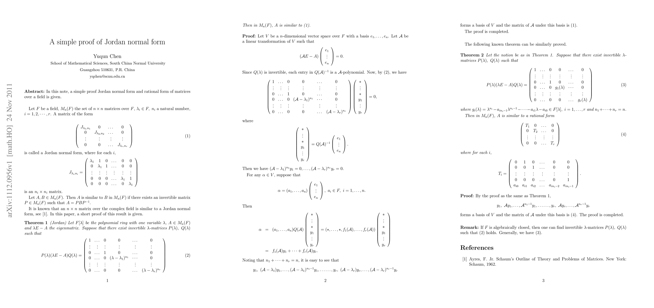 In this note, a simple proof Jordan normal form and rational form of matrices over a field is given.