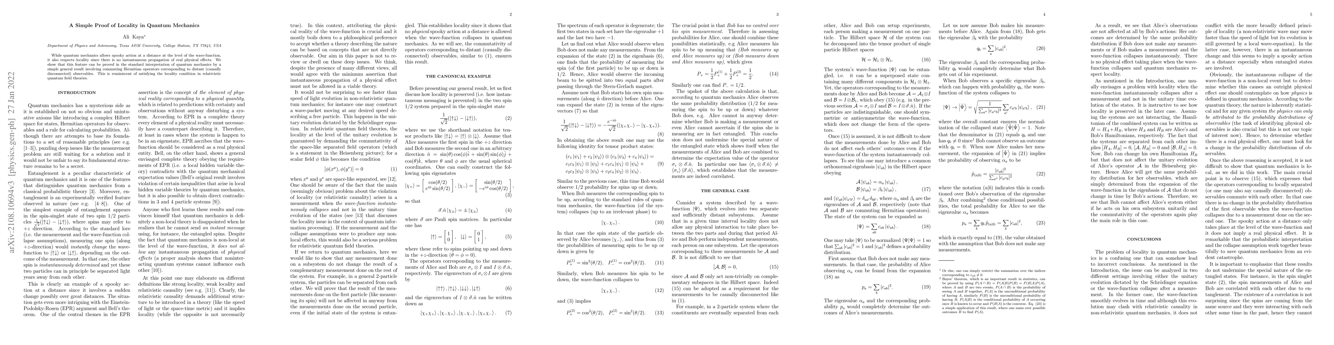 This paper demonstrates that quantum mechanics respects locality despite wave-function entanglement, proving that no real physical effects propagate instantaneously through commuting Hermitian operators for distant, causally disconnected observables. This aligns with the locality conditions seen in relativistic quantum field theories.