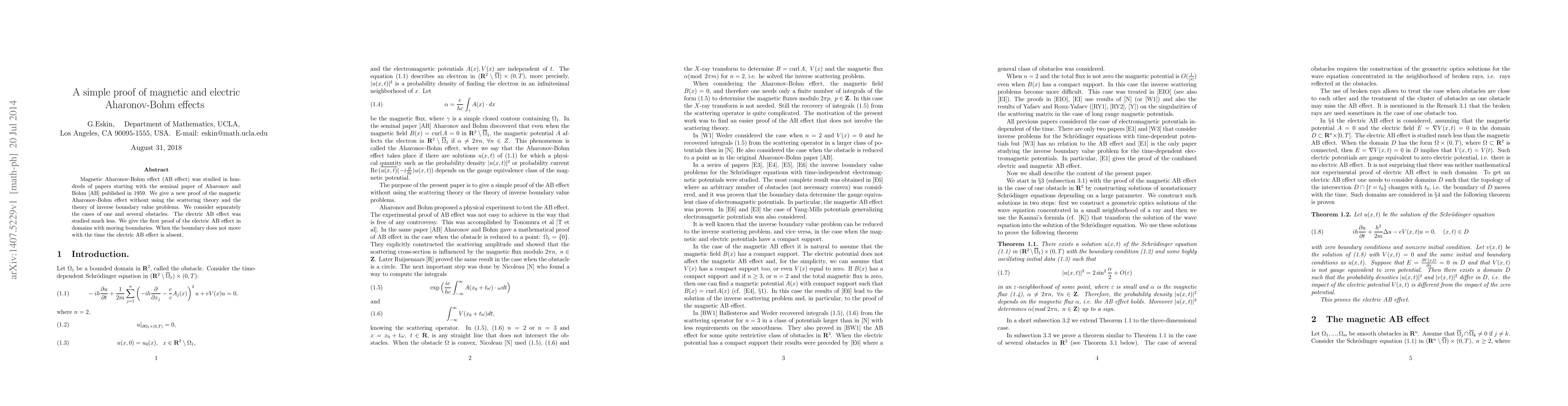 Magnetic Aharonov-Bohm effect (AB effect) was studied in hundreds of papers starting with the seminal paper of Aharonov and Bohm [AB] published in 1959. We give a new proof of the magnetic Aharonov-Bohm effect without using the scattering theory and the theory of inverse boundary value problems. We consider separately the cases of one and several obstacles. The electric AB effect was studied much less. We give the first proof of the electric AB effect in domains with moving boundaries. When the boundary does not move with the time the electric AB effect is absent.