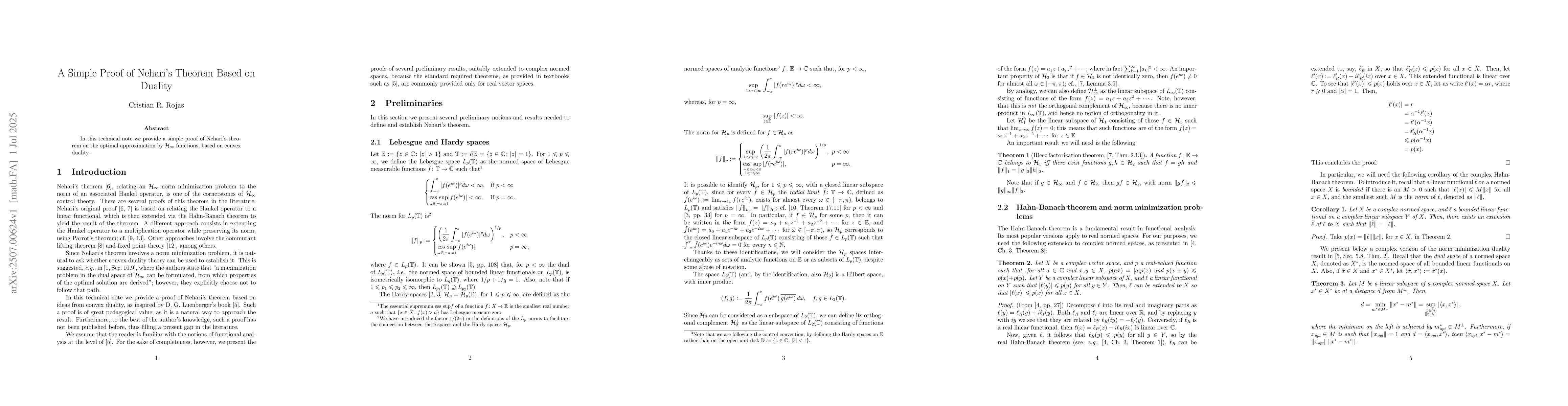 In this technical note we provide a simple proof of Nehari's theorem on the optimal approximation by $H_\infty$ functions, based on convex duality.