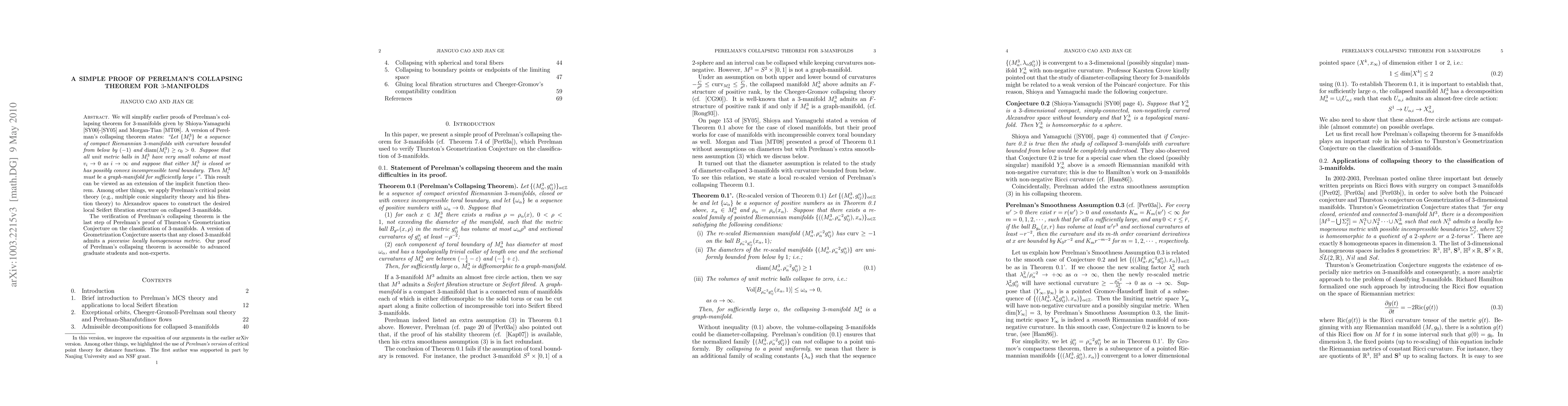This paper simplifies the proof of Perelman's collapsing theorem for 3-manifolds, utilizing Perelman's critical point theory to construct local Seifert fibration structures. The proof is designed to be accessible to advanced graduate students and non-experts, serving as a final step in the proof of Thurston's Geometrization Conjecture.