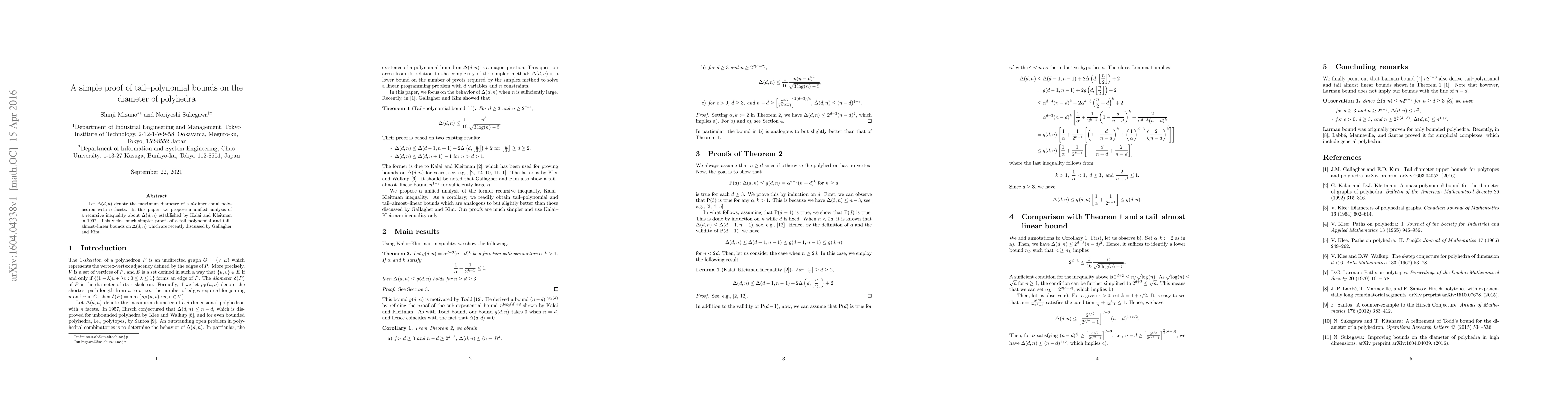 This paper presents a unified analysis of a recursive inequality regarding the diameter of $d$-dimensional polyhedra with $n$ facets, simplifying the proofs of tail-polynomial and tail-almost-linear bounds on the diameter established by Gallagher and Kim.