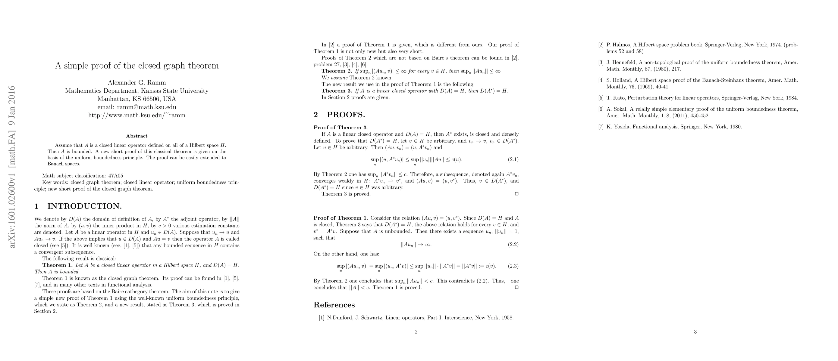 Summary: The paper presents a concise proof of the closed graph theorem using the uniform boundedness principle, demonstrating that any closed linear operator defined on a Hilbert space is bounded, with an extension to Banach spaces.