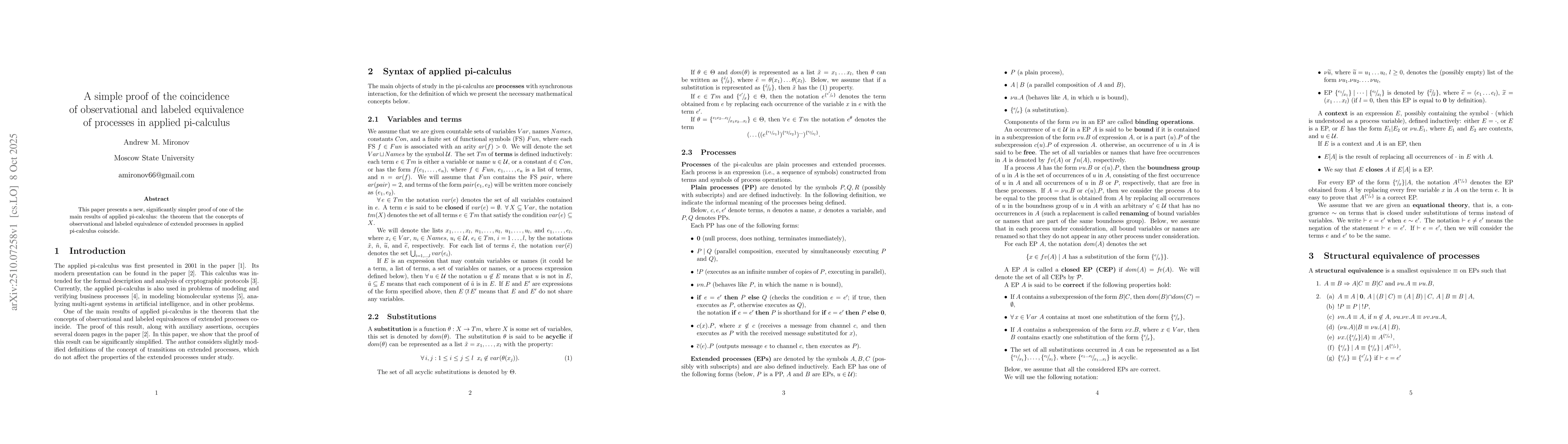 This paper presents a new, significantly simpler proof of one of the main results of applied pi-calculus: the theorem that the concepts of observational and labeled equivalence of extended processes in applied pi-calculus coincide.