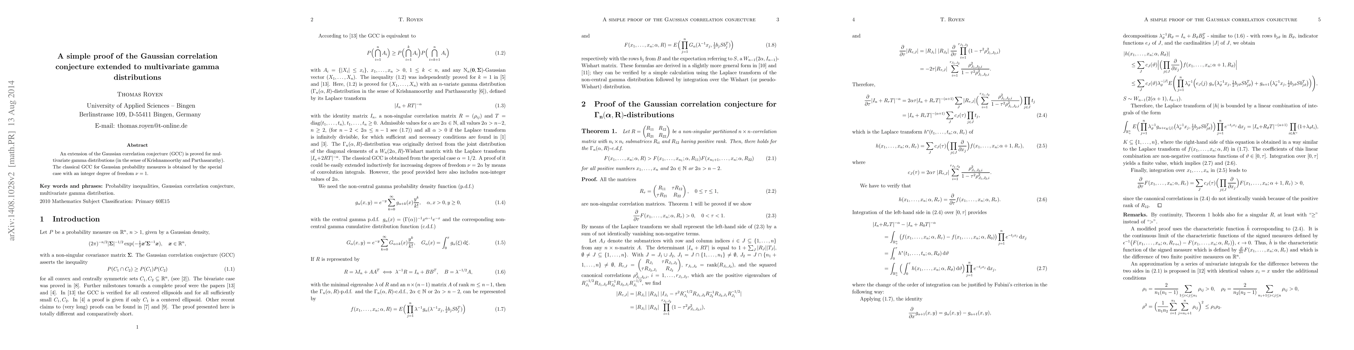 An extension of the Gaussian correlation conjecture (GCC) is proved for multivariate gamma distributions (in the sense of Krishnamoorthy and Parthasarathy). The classical GCC for Gaussian probability measures is obtained by the special case with one degree of freedom.