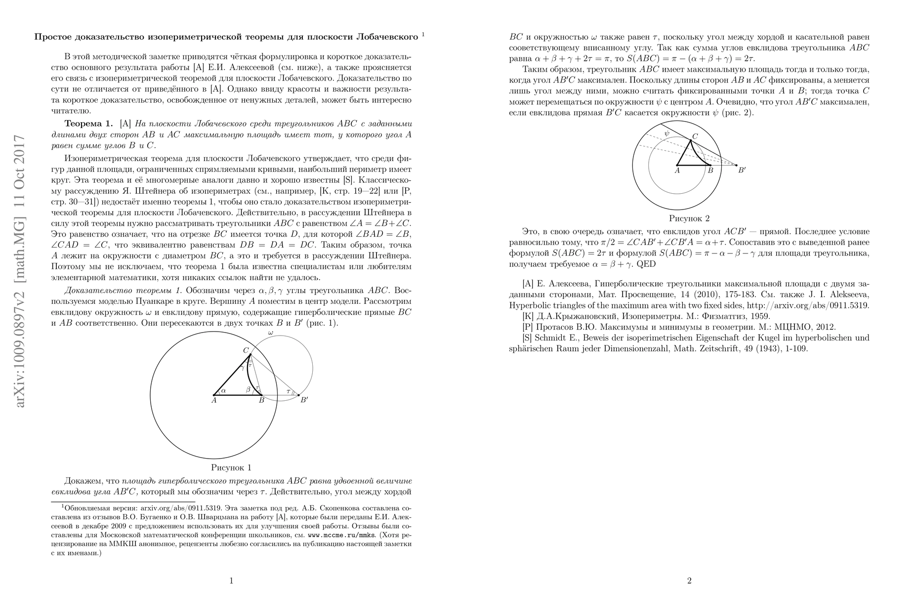 In this pedagogical note we present a short proof of the following main result of arxiv.org/abs/0911.5319, and clarify its relation to the isoperimetric problem. On the hyperbolic plane consider triangles ABC with fixed lengths of AB and AC. The maximal area of these triangles is attained for the triangle ABC such that \angle A=\angle B+\angle C. The proof is essentially the same as in the above-cited paper. However, since the result is beautiful and important, a short proof cleared of unnecessary details could be interesting for a reader. The note is accessible for students familiar with elementary hyperbolic geometry. (This note is based on referee reports to the above paper, see www.mccme.ru/mmks)