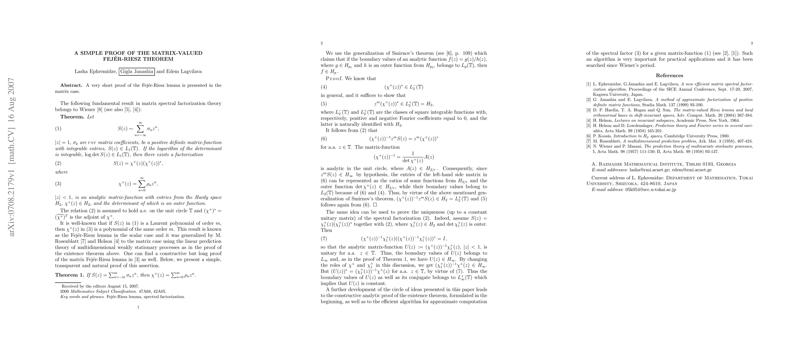 This paper provides a succinct proof for the matrix-valued version of the Fejér-Riesz lemma, offering a straightforward approach to this theorem in matrix theory.