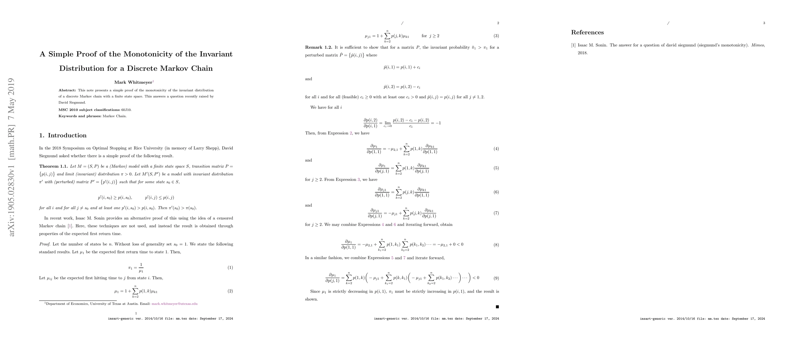 A discrete Markov chain's invariant distribution is proven to be monotonic, ensuring that as the number of states increases, the probability of transitioning from one state to another also increases.