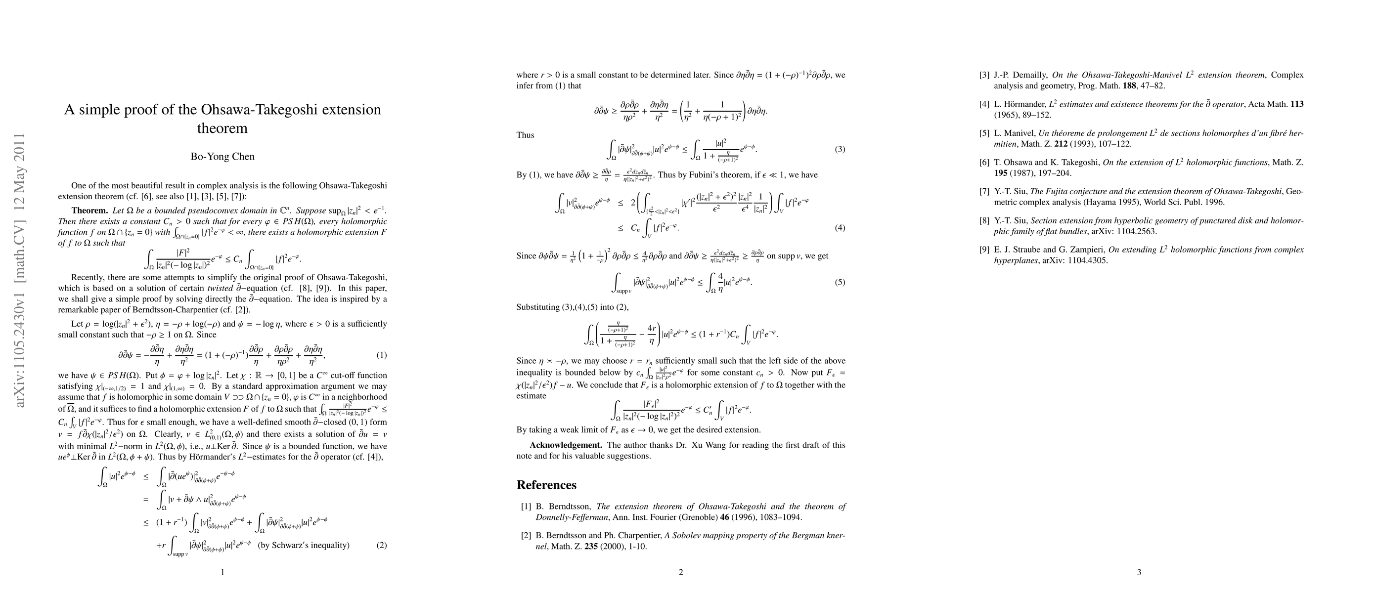 Summary: This paper presents a straightforward proof of the Ohsawa-Takegoshi extension theorem by directly solving the d-bar equation, offering a novel approach to the classical result.