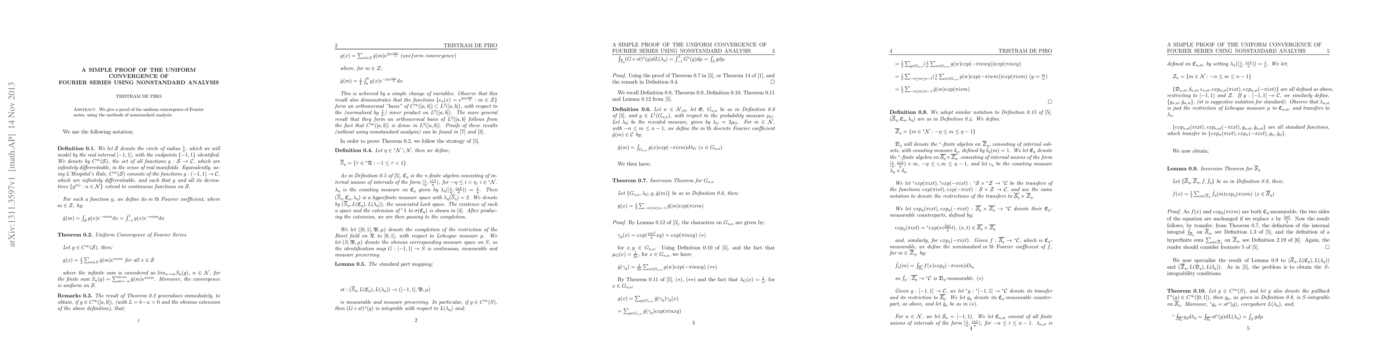 Summary: This paper presents a proof for the uniform convergence of Fourier series utilizing nonstandard analysis techniques, offering a novel approach to a classical problem in harmonic analysis.