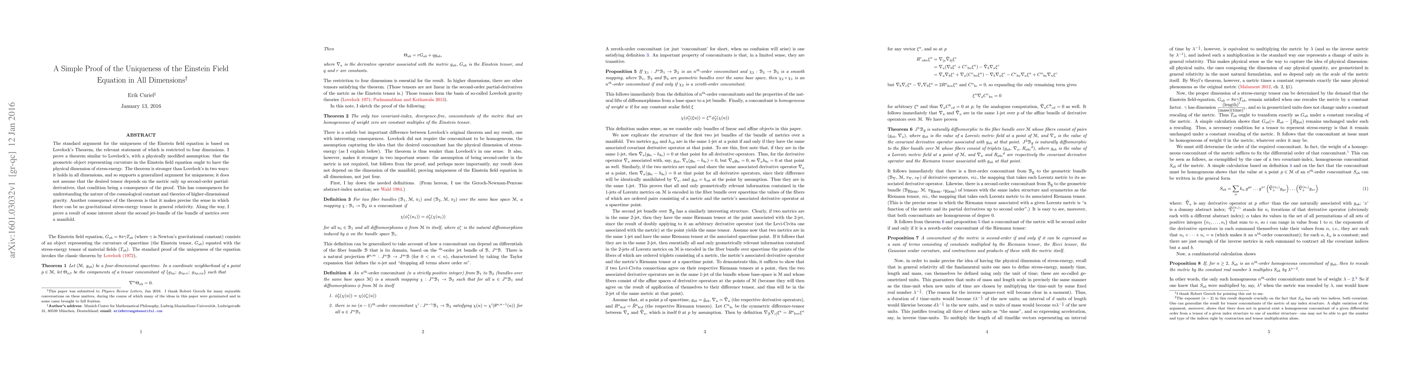 The standard argument for the uniqueness of the Einstein field equation is based on Lovelock's Theorem, the relevant statement of which is restricted to four dimensions. I prove a theorem similar to Lovelock's, with a physically modified assumption: that the geometric object representing curvature in the Einstein field equation ought to have the physical dimension of stress-energy. The theorem is stronger than Lovelock's in two ways: it holds in all dimensions, and so supports a generalized argument for uniqueness; it does not assume that the desired tensor depends on the metric only up second-order partial-derivatives, that condition being a consequence of the proof. This has consequences for understanding the nature of the cosmological constant and theories of higher-dimensional gravity. Another consequence of the theorem is that it makes precise the sense in which there can be no gravitational stress-energy tensor in general relativity. Along the way, I prove a result of some interest about the second jet-bundle of the bundle of metrics over a manifold.
