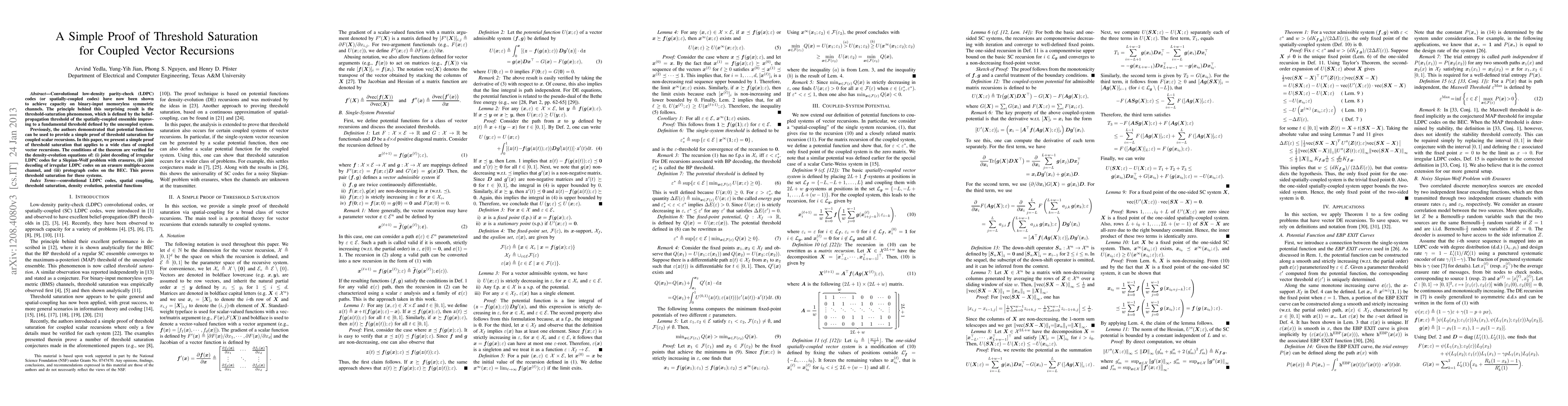 Convolutional low-density parity-check (LDPC) codes (or spatially-coupled codes) have now been shown to achieve capacity on binary-input memoryless symmetric channels. The principle behind this surprising result is the threshold-saturation phenomenon, which is defined by the belief-propagation threshold of the spatially-coupled ensemble saturating to a fundamental threshold defined by the uncoupled system. Previously, the authors demonstrated that potential functions can be used to provide a simple proof of threshold saturation for coupled scalar recursions. In this paper, we present a simple proof of threshold saturation that applies to a wide class of coupled vector recursions. The conditions of the theorem are verified for the density-evolution equations of: (i) joint decoding of irregular LDPC codes for a Slepian-Wolf problem with erasures, (ii) joint decoding of irregular LDPC codes on an erasure multiple-access channel, and (iii) general protograph codes on the BEC. This proves threshold saturation for these systems.