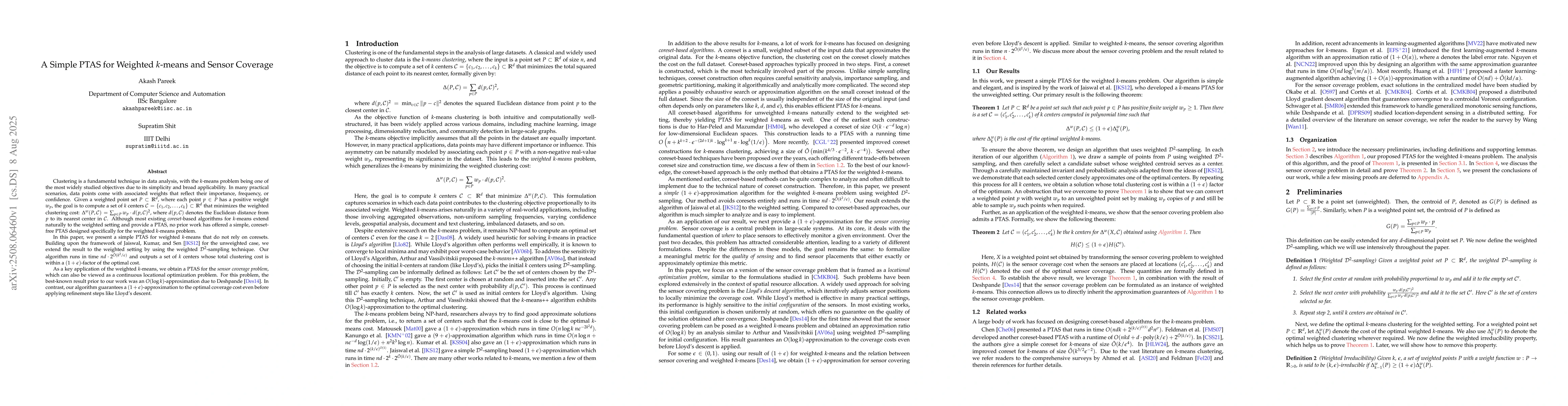 This work presents the first simple, coreset-free PTAS for weighted $k$-means, contrasting with existing coreset-based algorithms, and applies it to improve the approximation for the sensor coverage problem.