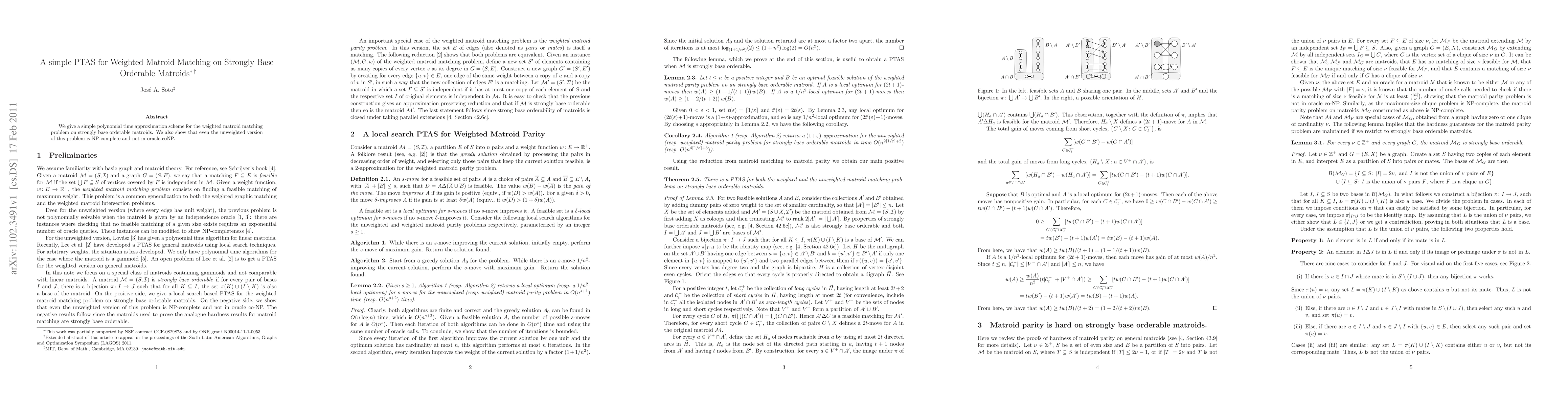 Summary: This paper presents a straightforward polynomial time approximation scheme for the weighted matroid matching problem on strongly base orderable matroids. Additionally, it demonstrates that the unweighted version of this problem is NP-complete and does not belong to oracle-coNP.