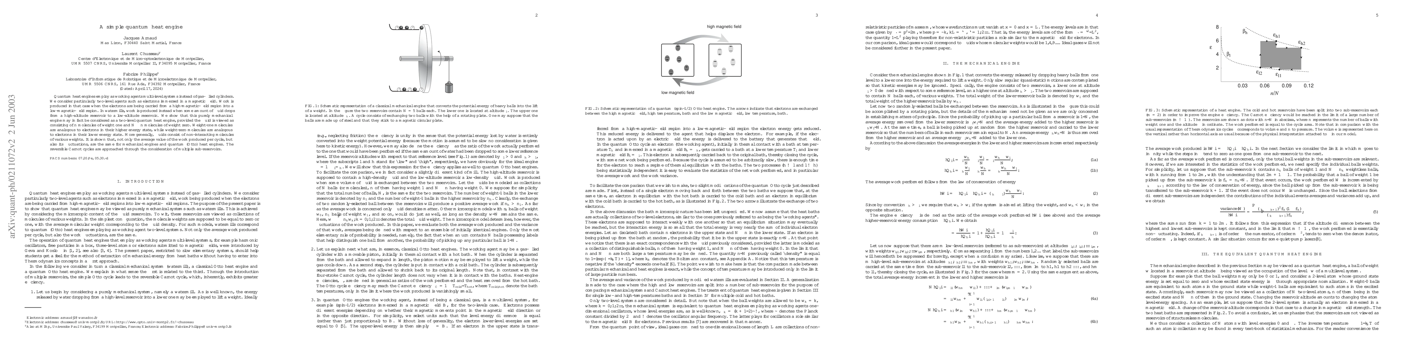 Quantum heat engines employ as working agents multi-level systems instead of gas-filled cylinders. We consider particularly two-level agents such as electrons immersed in a magnetic field. Work is produced in that case when the electrons are being carried from a high-magnetic-field region into a low-magnetic-field region. In watermills, work is produced instead when some amount of fluid drops from a high-altitude reservoir to a low-altitude reservoir. We show that this purely mechanical engine may in fact be considered as a two-level quantum heat engine, provided the fluid is viewed as consisting of n molecules of weight one and N-n molecules of weight zero. Weight-one molecules are analogous to electrons in their higher energy state, while weight-zero molecules are analogous to electrons in their lower energy state. More generally, fluids consist of non-interacting molecules of various weights. It is shown that, not only the average value of the work produced per cycle, but also its fluctuations, are the same for mechanical engines and quantum (Otto) heat engines. The reversible Carnot cycles are approached through the consideration of multiple sub-reservoirs.