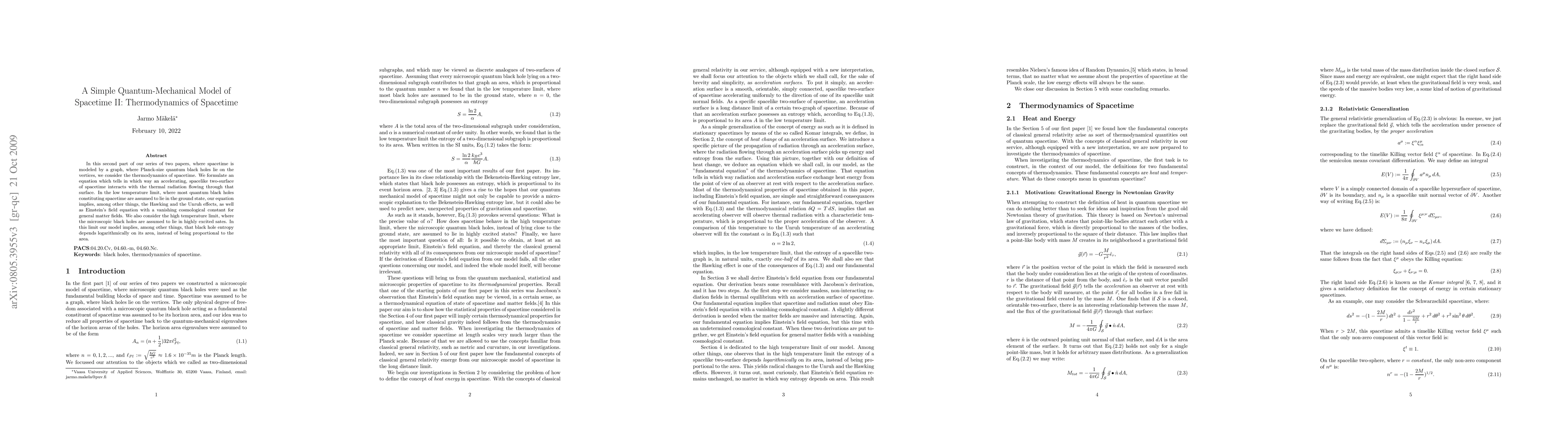 In this second part of our series of two papers, where spacetime is modelled by a graph, where Planck size quantum black holes lie on the vertices, we consider the thermodynamics of spacetime. We formulate an equation which tells in which way an accelerating, spacelike two-surface of spacetime interacts with the thermal radiation flowing through that surface. In the low temperature limit, where most quantum black holes constituting spacetime are assumed to lie in the ground state, our equation implies, among other things, the Hawking and the Unruh effects, as well as Einstein's field equation with a vanishing cosmological constant for general matter fields. We also consider the high temperature limit, where the microscopic black holes are assumed to lie in highly excited states. In this limit our model implies, among other things, that black hole entropy depends logarithmically on its area, instead of being proportional to the area.