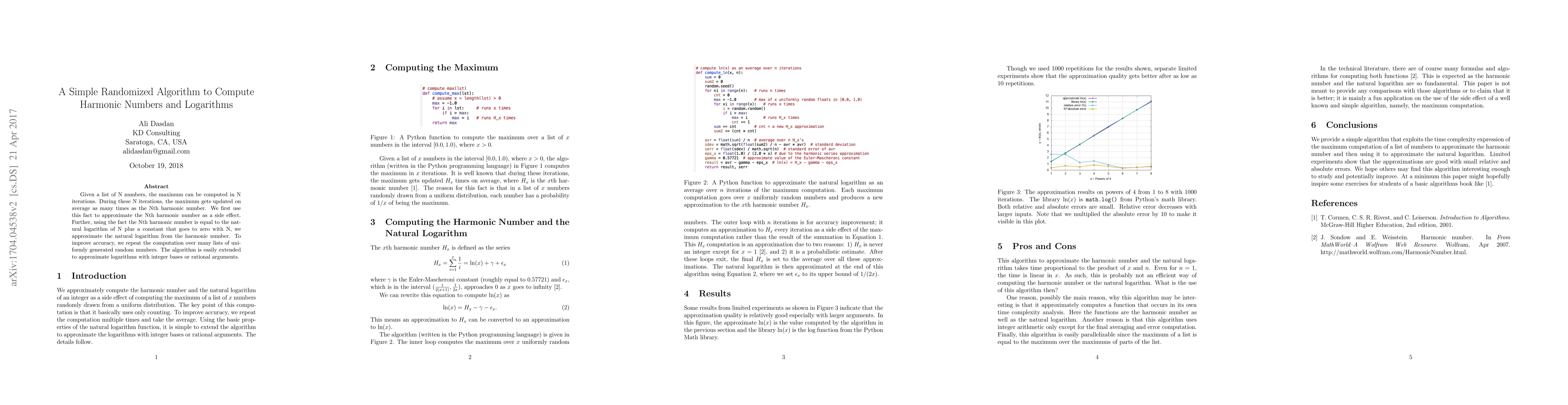 Given a list of N numbers, the maximum can be computed in N iterations. During these N iterations, the maximum gets updated on average as many times as the Nth harmonic number. We first use this fact to approximate the Nth harmonic number as a side effect. Further, using the fact the Nth harmonic number is equal to the natural logarithm of N plus a constant that goes to zero with N, we approximate the natural logarithm from the harmonic number. To improve accuracy, we repeat the computation over many lists of uniformly generated random numbers. The algorithm is easily extended to approximate logarithms with integer bases or rational arguments.