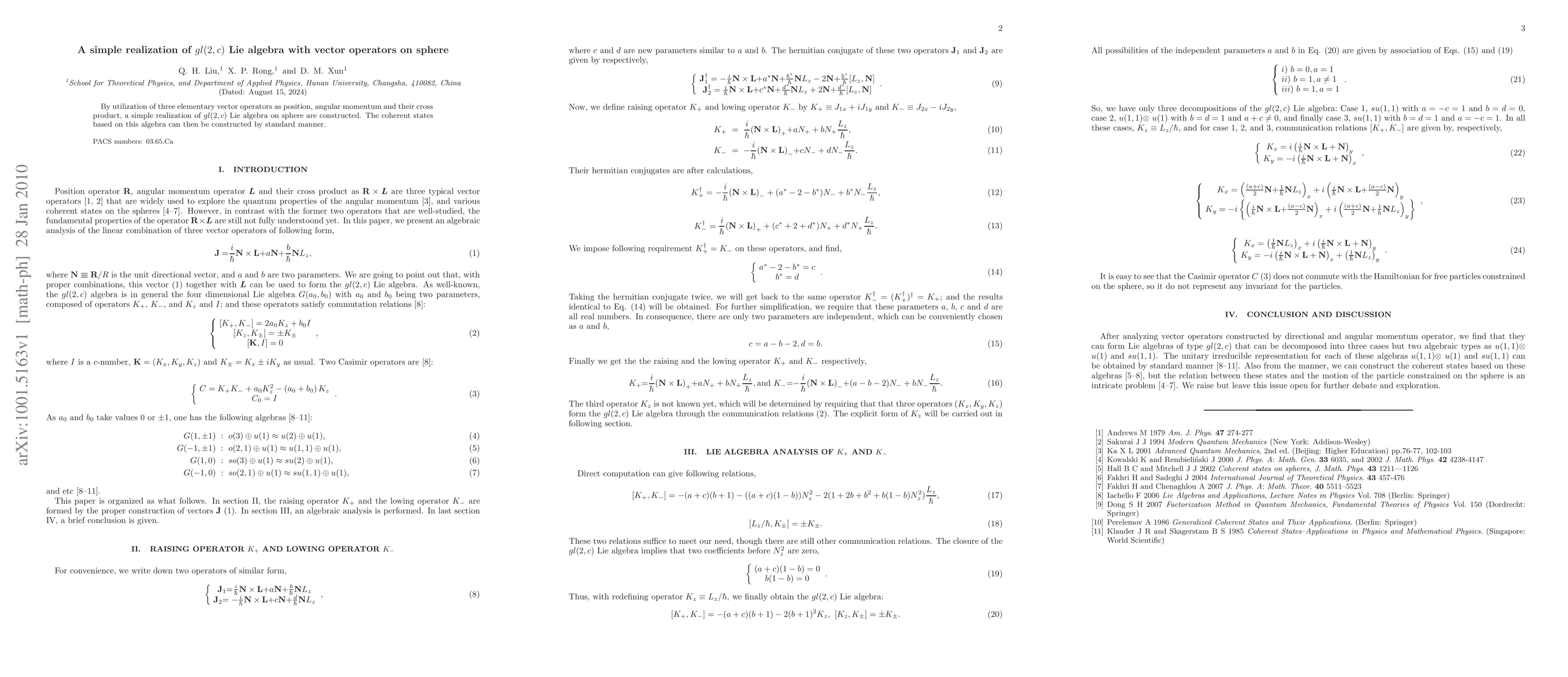 By utilization of three elementary vector operators as position, angular momentum and their cross product, a simple realization of gl(2,c) Lie algebra on sphere are constructed. The coherent states based on this algebra can then be constructed by standard manner.