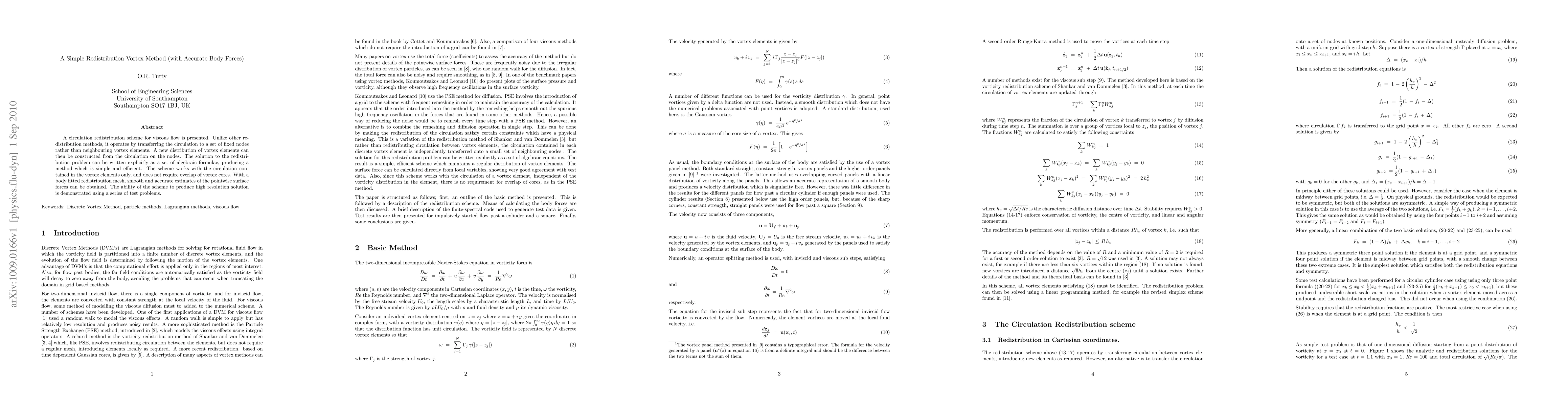 This paper introduces a simple and efficient redistribution vortex method for viscous flow that transfers circulation to fixed nodes, allowing for explicit algebraic solutions and high-resolution results. The method also provides accurate body forces estimations using a body-fitted redistribution mesh.