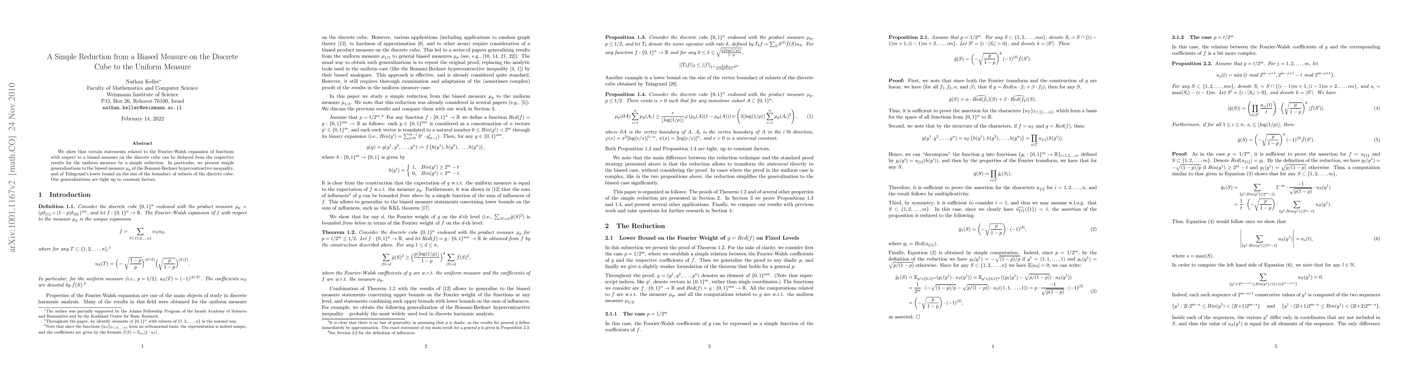 Researchers demonstrate a reduction in Fourier-Walsh expansion results for biased measures on the discrete cube to those for the uniform measure, establishing generalizations of hypercontractive inequality and Talagrand's lower bound with tight constant factors.