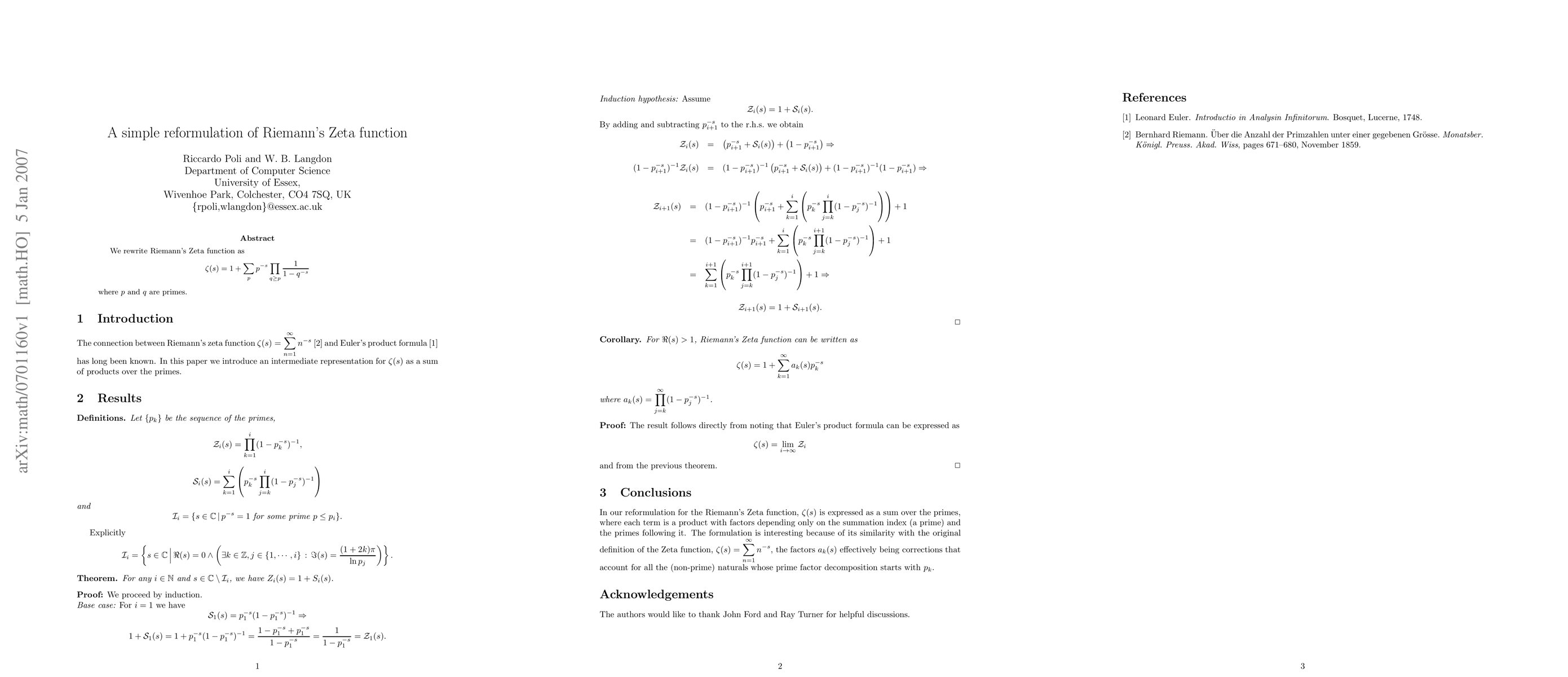 This paper reformulates the Riemann Zeta function as a sum over primes, simplifying its form into products that depend only on prime indices and subsequent primes.