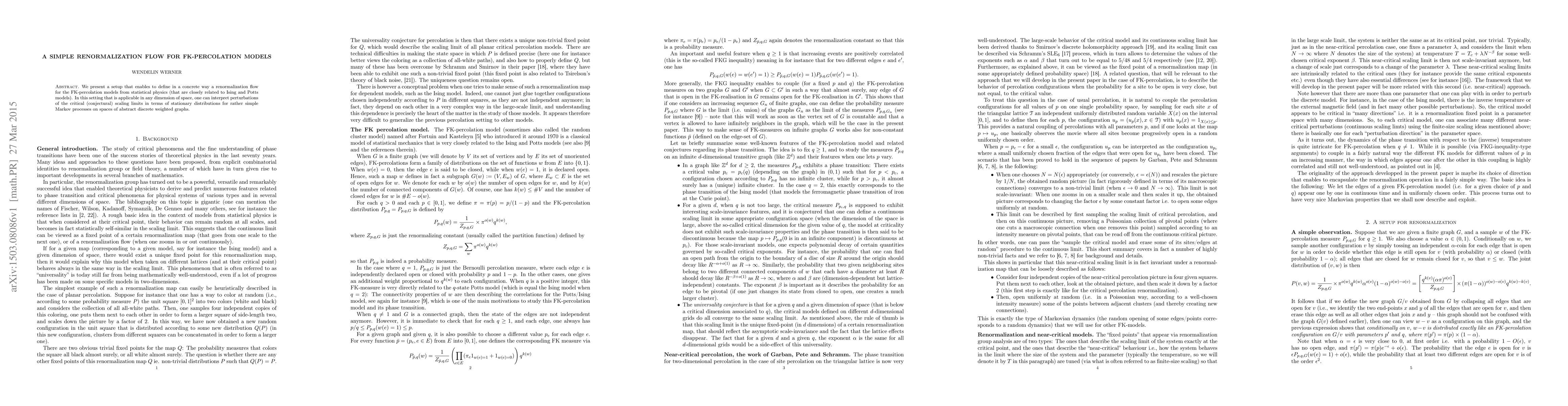 Researchers developed a method to analyze FK-percolation models using a simple renormalization flow, allowing for the study of critical limits in any dimension and enabling interpretation of perturbations as stationary distributions.