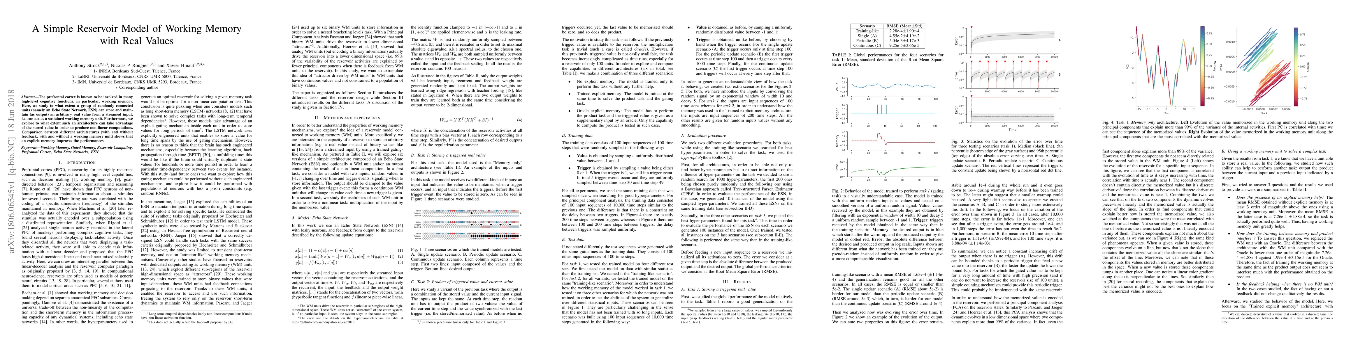 This paper investigates the capacity of an Echo State Network (ESN) to function as a working memory unit by storing and maintaining real values from input streams. Results indicate that an ESN with explicit memory outperforms other architectures, demonstrating its potential for sustained working memory and non-linear computations.