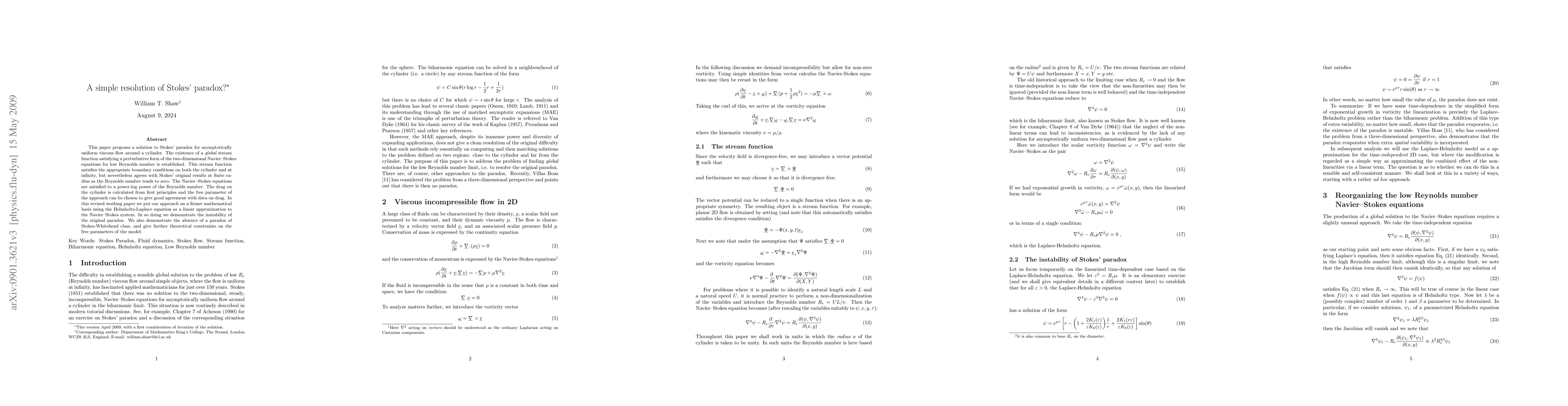 This paper proposes a solution to Stokes' paradox for asymptotically uniform viscous flow around a cylinder. The existence of a {\it global} stream function satisfying a perturbative form of the two-dimensional Navier-Stokes equations for low Reynolds number is established. This stream function satisfies the appropriate boundary conditions on both the cylinder and at infinity, but nevertheless agrees with Stokes' original results at finite radius as the Reynolds number tends to zero. The Navier-Stokes equations are satisfied to a power-log power of the Reynolds number. The drag on the cylinder is calculated from first principles and the free parameter of the approach can be chosen to give good agreement with data on drag. In this revised working paper we put our approach on a firmer mathematical basis using the Helmholtz-Laplace equation as a linear approximation to the Navier-Stokes system. In so doing we demonstrate the instability of the original paradox. We also demonstrate the absence of a paradox of Stokes-Whitehead class, and give further theoretical constraints on the free parameters of the model.