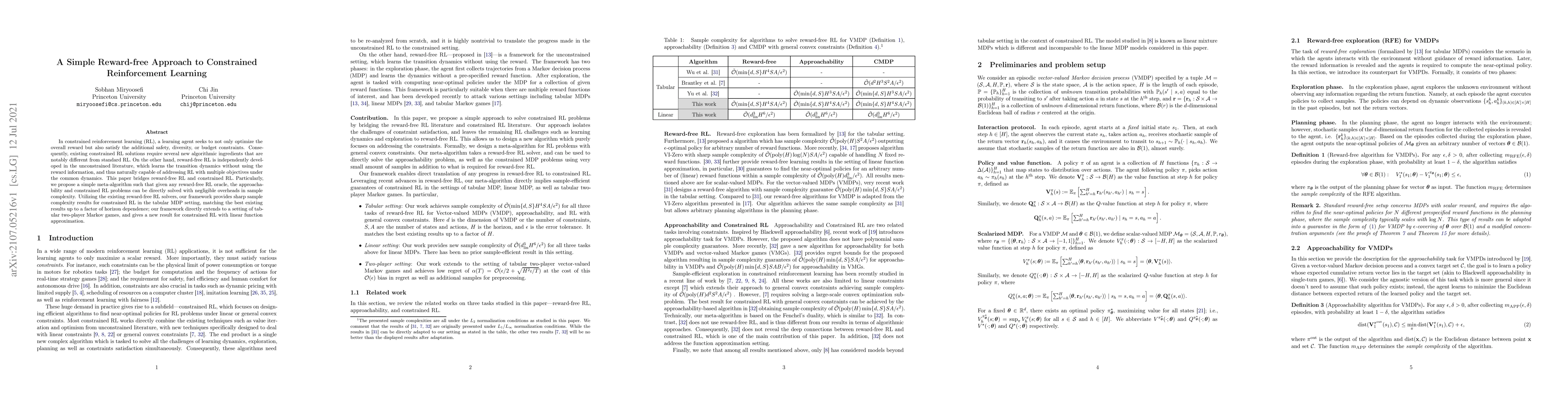 In constrained reinforcement learning (RL), a learning agent seeks to not only optimize the overall reward but also satisfy the additional safety, diversity, or budget constraints. Consequently, existing constrained RL solutions require several new algorithmic ingredients that are notably different from standard RL. On the other hand, reward-free RL is independently developed in the unconstrained literature, which learns the transition dynamics without using the reward information, and thus naturally capable of addressing RL with multiple objectives under the common dynamics. This paper bridges reward-free RL and constrained RL. Particularly, we propose a simple meta-algorithm such that given any reward-free RL oracle, the approachability and constrained RL problems can be directly solved with negligible overheads in sample complexity. Utilizing the existing reward-free RL solvers, our framework provides sharp sample complexity results for constrained RL in the tabular MDP setting, matching the best existing results up to a factor of horizon dependence; our framework directly extends to a setting of tabular two-player Markov games, and gives a new result for constrained RL with linear function approximation.