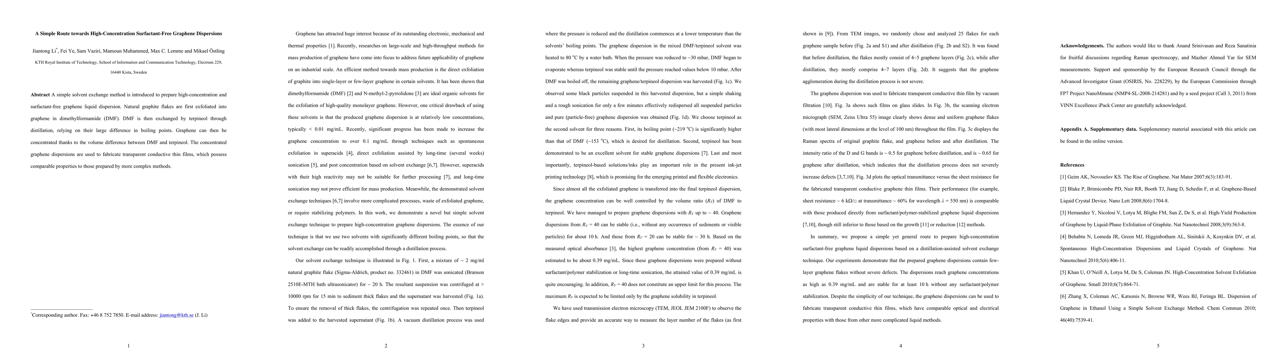 This paper presents a simple solvent exchange method to create high-concentration, surfactant-free graphene dispersions using natural graphite exfoliated in DMF, followed by concentration via terpineol. The resulting dispersions are used to fabricate transparent conductive films with properties similar to those from more complex methods.