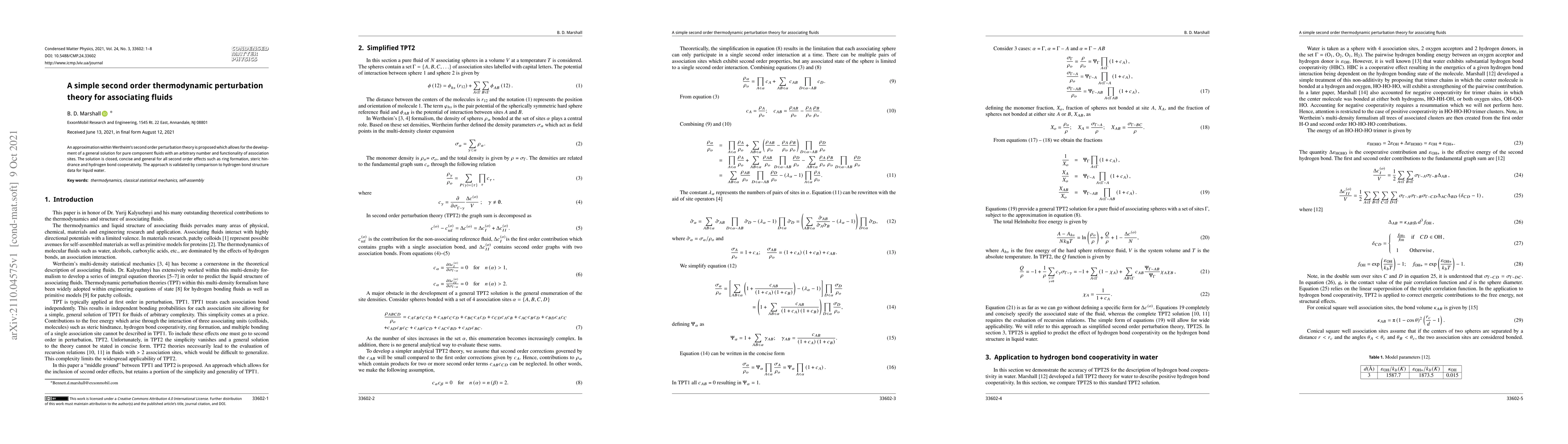 This paper proposes a simplified second order thermodynamic perturbation theory for associating fluids, offering a general solution for fluids with multiple association sites. The approach is validated against liquid water's hydrogen bond structure data.