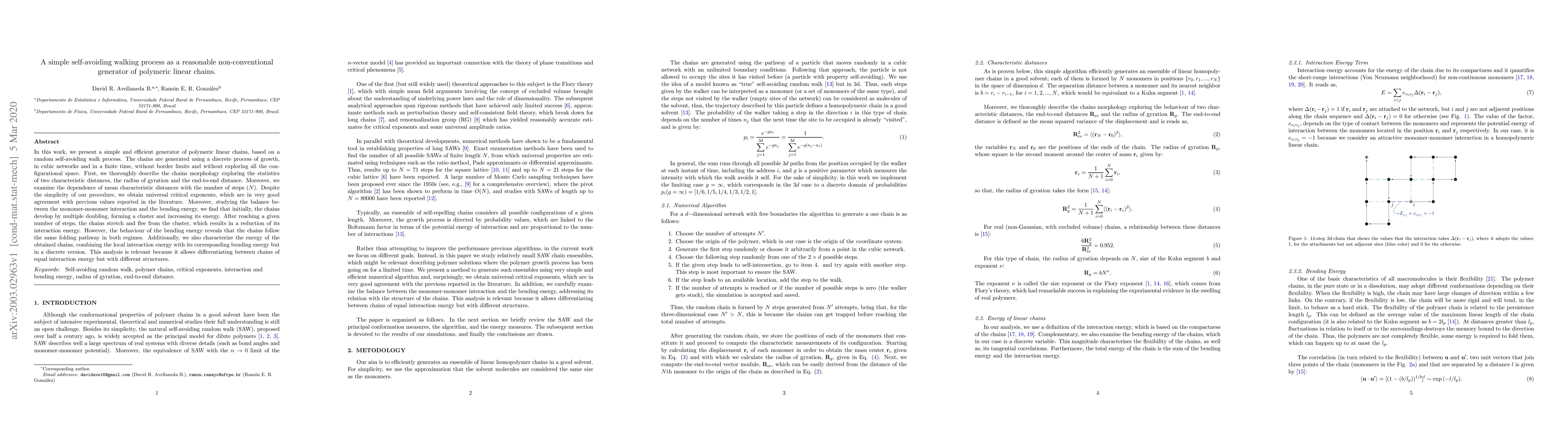 In this work, we present a simple and efficient generator of polymeric linear chains, based on a random self-avoiding walk process. The chains are generated using a discrete process of growth, in cubic networks and in a finite time, without border limits and without exploring all the configurational space. First, we thoroughly describe the chains morphology exploring the statistics of two characteristic distances, the radius of gyration and the end-to-end distance. Moreover, we examine the dependence of mean characteristic distances with the number of steps (N). Despite the simplicity of our procedure, we obtain universal critical exponents, which are in very good agreement with previous values reported in the literature. Moreover, studying the balance between the monomer-monomer interaction and the bending energy, we find that initially, the chains develop by multiple doubling, forming a cluster and increasing its energy. After reaching a given number of steps, the chains stretch and flee from the cluster, which results in a reduction of its interaction energy. However, the behaviour of the bending energy reveals that the chains follow the same folding pathway in both regimes. Additionally, we also characterize the energy of the obtained chains, combining the local interaction energy with its corresponding bending energy but in a discrete version. This analysis is relevant because it allows differentiating between chains of equal interaction energy but with different structures.