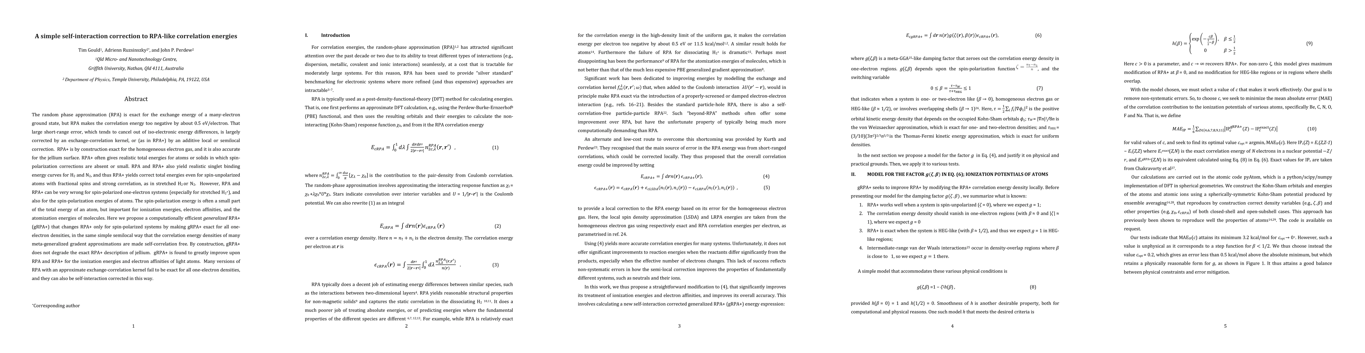 The random phase approximation (RPA) is exact for the exchange energy of a many-electron ground state, but RPA makes the correlation energy too negative by about 0.5 eV/electron. That large short-range error, which tends to cancel out of iso-electronic energy differences, is largely corrected by an exchange-correlation kernel, or (as in RPA+) by an additive local or semilocal correction. RPA+ is by construction exact for the homogeneous electron gas, and it is also accurate for the jellium surface. RPA+ often gives realistic total energies for atoms or solids in which spin-polarization corrections are absent or small. RPA and RPA+ also yield realistic singlet binding energy curves for H2 and N2, and thus RPA+ yields correct total energies even for spin-unpolarized atoms with fractional spins and strong correlation, as in stretched H2 or N2. However, RPA and RPA+ can be very wrong for spin-polarized one-electron systems (especially for stretched H2+), and also for the spin-polarization energies of atoms. The spin-polarization energy is often a small part of the total energy of an atom, but important for ionization energies, electron affinities, and the atomization energies of molecules. Here we propose a computationally efficient generalized RPA+ (gRPA+) that changes RPA+ only for spin-polarized systems by making gRPA+ exact for all one-electron densities, in the same simple semilocal way that the correlation energy densities of many meta-generalized gradent approximations are made self-correlation free. By construction, gRPA+ does not degrade the exact RPA+ description of jellium. gRPA+ is found to greatly improve upon RPA and RPA+ for the ionization energies and electron affinities of light atoms. Many versions of RPA with an approximate exchange-correlation kernel fail to be exact for all one-electron densities, and they can also be self-interaction corrected in this way.