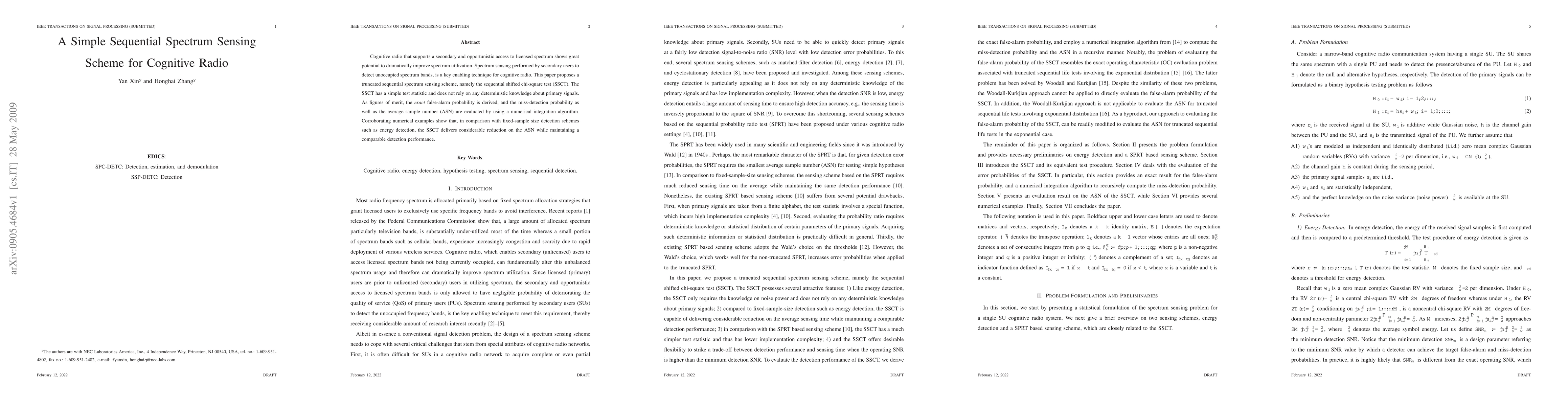 This paper proposes a simple sequential spectrum sensing scheme, the sequential shifted chi-square test (SSCT), for cognitive radio to detect unoccupied spectrum bands. The SSCT reduces the average sample number while maintaining comparable detection performance compared to fixed-sample size methods like energy detection.