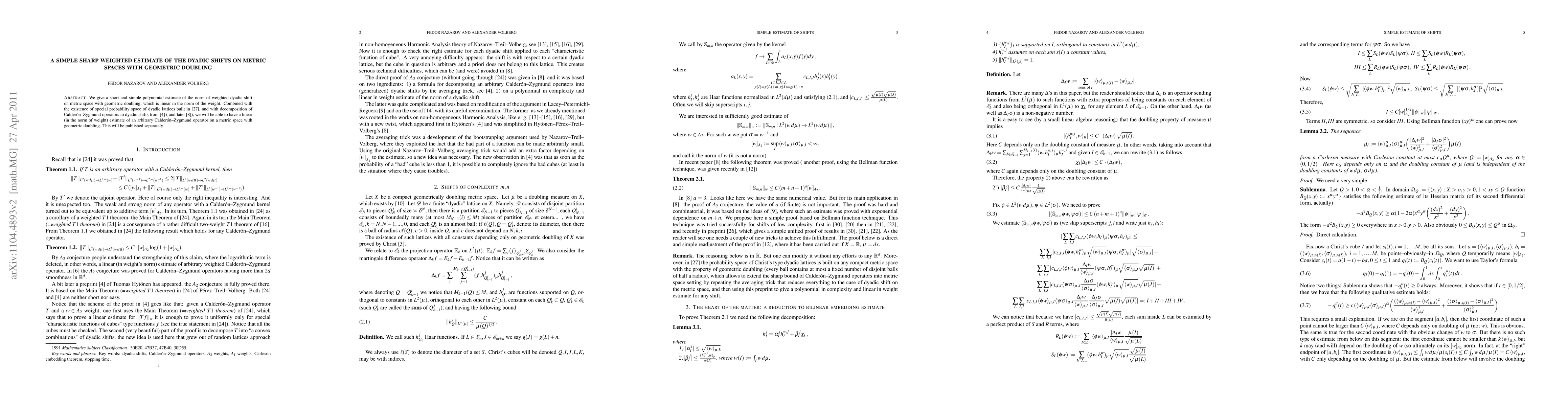 We give a short and simple polynomial estimate of the norm of weighted dyadic shift on metric space with geometric doubling, which is linear in the norm of the weight. Combined with the existence of special probability space of dyadic lattices built in A. Reznikov, A. Volberg, "Random "dyadic" lattice in geometrically doubling metric space and $A_2$ conjecture", arXiv:1103.5246, and with decomposition of Calder\'on-Zygmund operators to dyadic shifts from Hyt\"onen's "The sharp weighted bound for general Calder\'on-Zygmund operators", arXiv:1007.4330 (and later T. Hyt\"onen, C. P\'erez, S. Treil, A. Volberg, "A sharp estimated of weighted dyadic shifts that gives the proof of $A_2$ conjecture", arXiv 1010.0755), we will be able to have a linear (in the norm of weight) estimate of an arbitrary Calder\'on-Zygmund operator on a metric space with geometric doubling. This will be published separately.