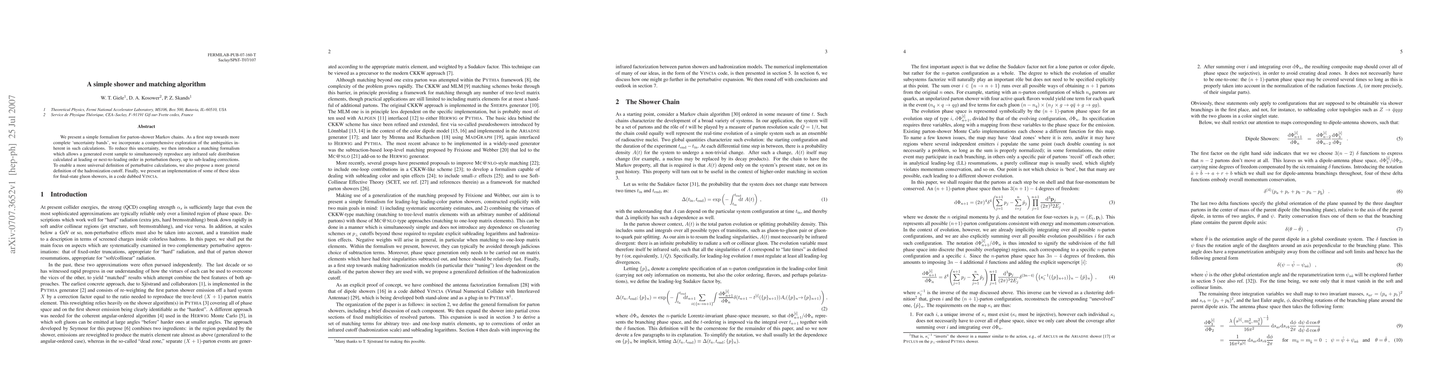 The paper introduces a straightforward formalism for parton-shower Markov chains, addressing ambiguities with a matching algorithm to reproduce leading or next-to-leading order distributions. It also proposes a general definition for the hadronization cutoff, and presents a code, VINCIA, for final-state gluon showers.
