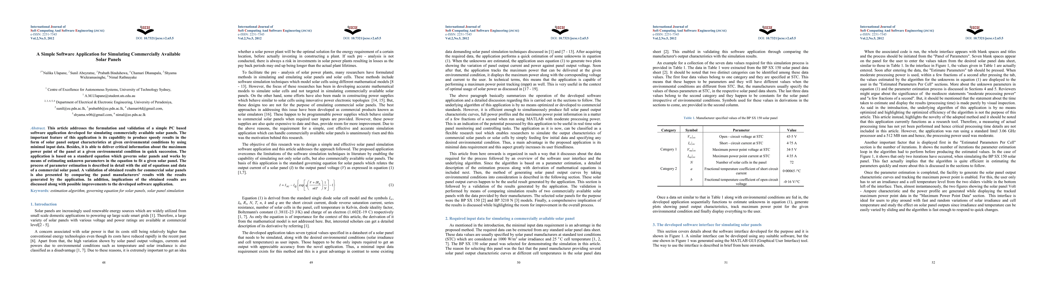 A simple PC-based software application simulates commercially available solar panels by estimating unknown parameters in a standard equation, producing quick results on output characteristics and maximum power point under given environmental conditions.