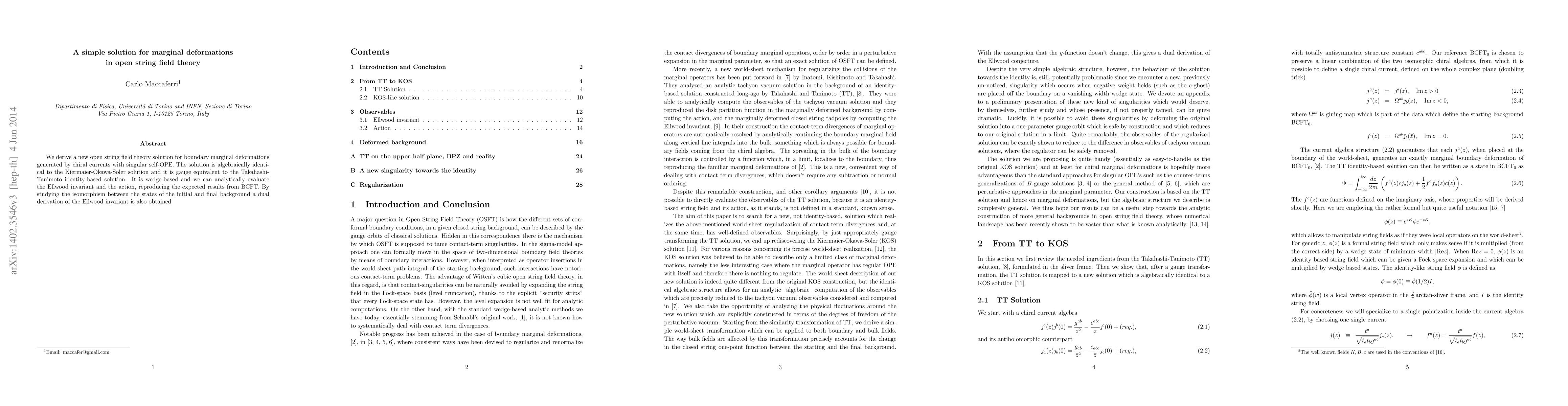 This paper presents a new open string field theory solution for marginal deformations induced by chiral currents, equivalent to existing solutions and providing an analytical evaluation of the Ellwood invariant and action, confirming results from boundary conformal field theory (BCFT). The solution also reveals a dual derivation of the Ellwood invariant through state isomorphism.