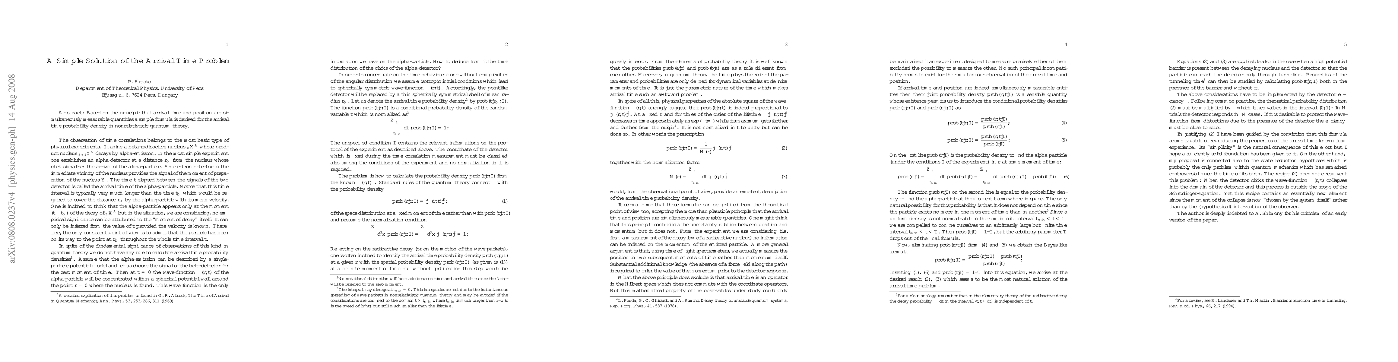 Researchers derived a simple formula to calculate the probability density of arrival time in nonrelativistic quantum theory, using the principle that arrival time and position are simultaneously measurable.