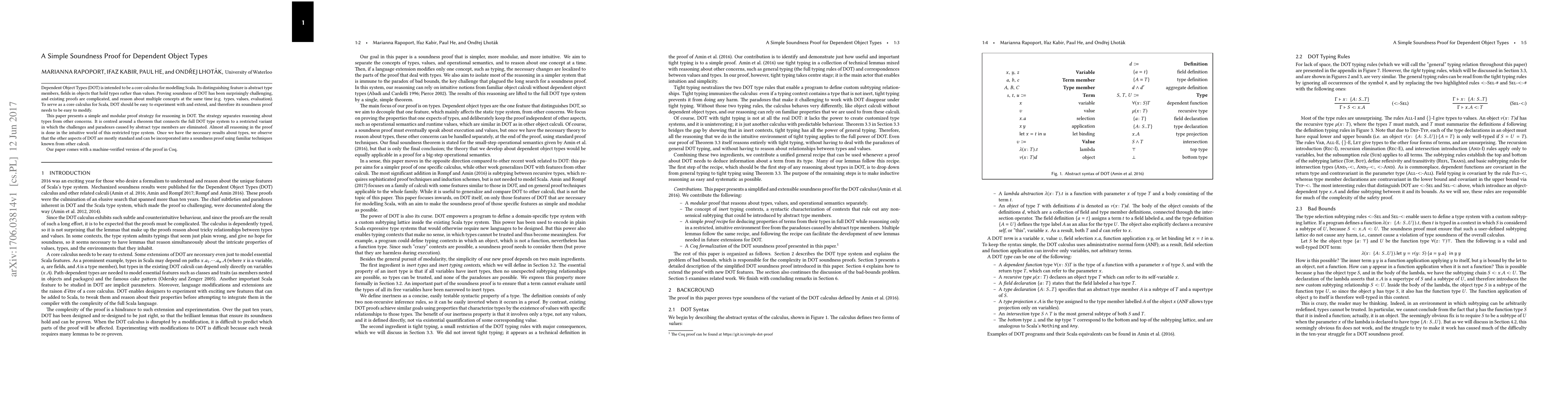 This paper introduces a simplified and modular proof strategy for the soundness of Dependent Object Types (DOT), focusing on separating type reasoning from other concerns, and presents a machine-verified proof in Coq to facilitate experimentation and extension.
