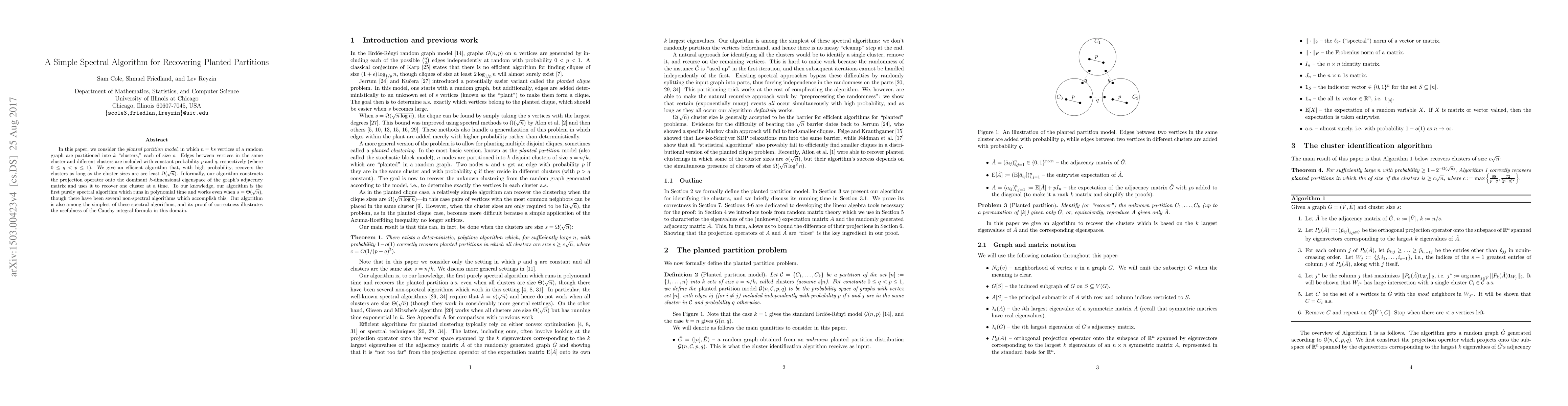 In this paper, we consider the planted partition model, in which $n = ks$ vertices of a random graph are partitioned into $k$ "clusters," each of size $s$. Edges between vertices in the same cluster and different clusters are included with constant probability $p$ and $q$, respectively (where $0 \le q < p \le 1$). We give an efficient algorithm that, with high probability, recovers the clusters as long as the cluster sizes are are least $\Omega(\sqrt{n})$. Informally, our algorithm constructs the projection operator onto the dominant $k$-dimensional eigenspace of the graph's adjacency matrix and uses it to recover one cluster at a time. To our knowledge, our algorithm is the first purely spectral algorithm which runs in polynomial time and works even when $s = \Theta(\sqrt n)$, though there have been several non-spectral algorithms which accomplish this. Our algorithm is also among the simplest of these spectral algorithms, and its proof of correctness illustrates the usefulness of the Cauchy integral formula in this domain.