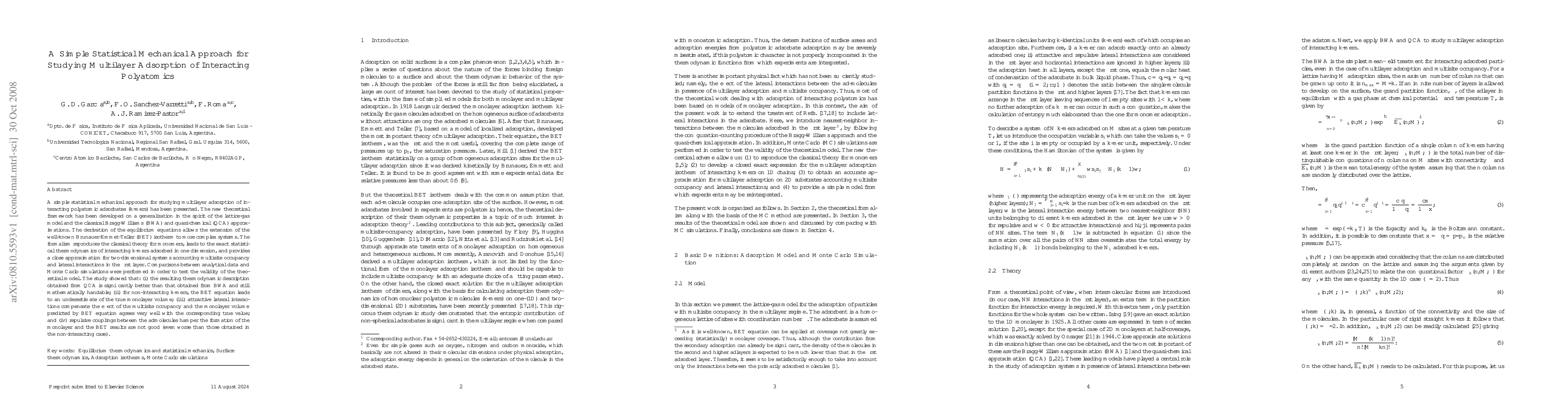 A simple statistical mechanical approach for studying multilayer adsorption of interacting polyatomic adsorbates (k-mers) has been presented. The new theoretical framework has been developed on a generalization in the spirit of the lattice-gas model and the classical Bragg-Williams (BWA) and quasi-chemical (QCA) approximations. The derivation of the equilibrium equations allows the extension of the well-known Brunauer-Emmet-Teller (BET) isotherm to more complex systems. The formalism reproduces the classical theory for monomers, leads to the exact statistical thermodynamics of interacting k-mers adsorbed in one dimension, and provides a close approximation for two-dimensional systems accounting multisite occupancy and lateral interactions in the first layer. Comparisons between analytical data and Monte Carlo simulations were performed in order to test the validity of the theoretical model. The study showed that: (i) the resulting thermodynamic description obtained from QCA is significantly better than that obtained from BWA and still mathematically handable; (ii) for non-interacting k-mers, the BET equation leads to an underestimate of the true monolayer volume; (iii) attractive lateral interactions compensate the effect of the multisite occupancy and the monolayer volume predicted by BET equation agrees very well with the corresponding true value; and (iv) repulsive couplings between the admolecules hamper the formation of the monolayer and the BET results are not good (even worse than those obtained in the non-interacting case).