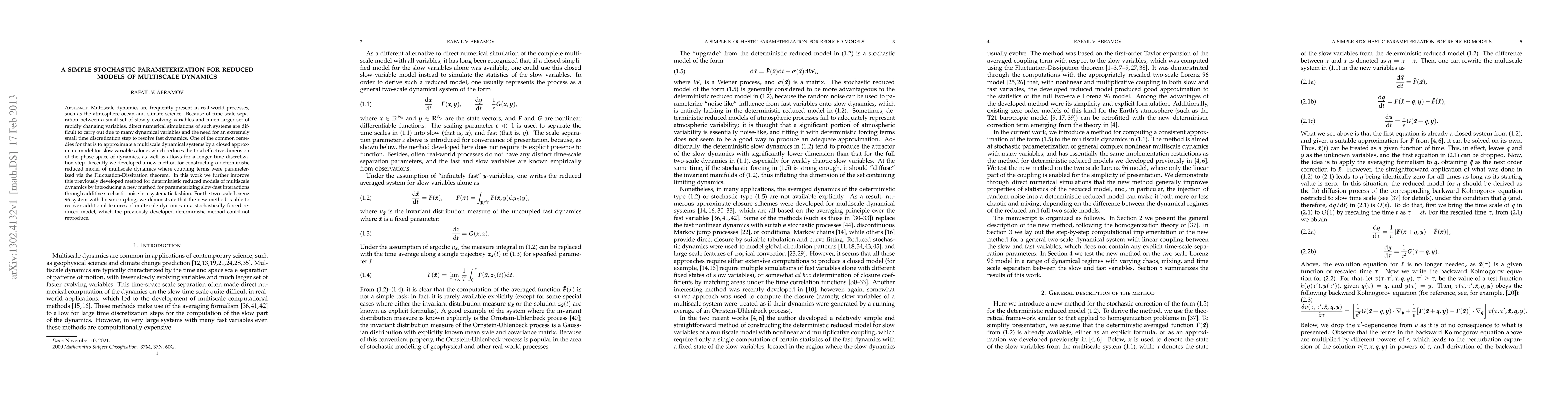 This paper introduces a stochastic parameterization method to improve reduced models of multiscale dynamics, demonstrating its effectiveness in capturing additional features in a stochastically forced two-scale Lorenz 96 system compared to a previous deterministic approach.