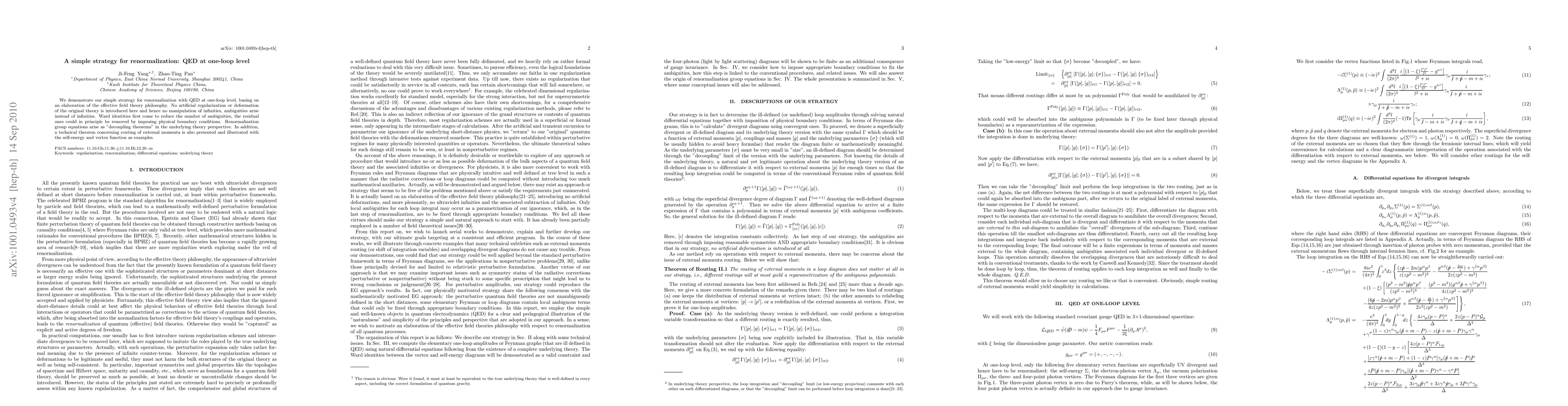 We demonstrate our simple strategy for renormalization with QED at one-loop level, basing on an elaboration of the effective field theory philosophy. No artificial regularization or deformation of the original theory is introduced here and hence no manipulation of infinities, ambiguities arise instead of infinities. Ward identities first come to reduce the number of ambiguities, the residual ones could in principle be removed by imposing physical boundary conditions. Renormalization group equations arise as "decoupling theorems" in the underlying theory perspective. In addition, a technical theorem concerning routing of external momenta is also presented and illustrated with the self-energy and vertex function as examples.