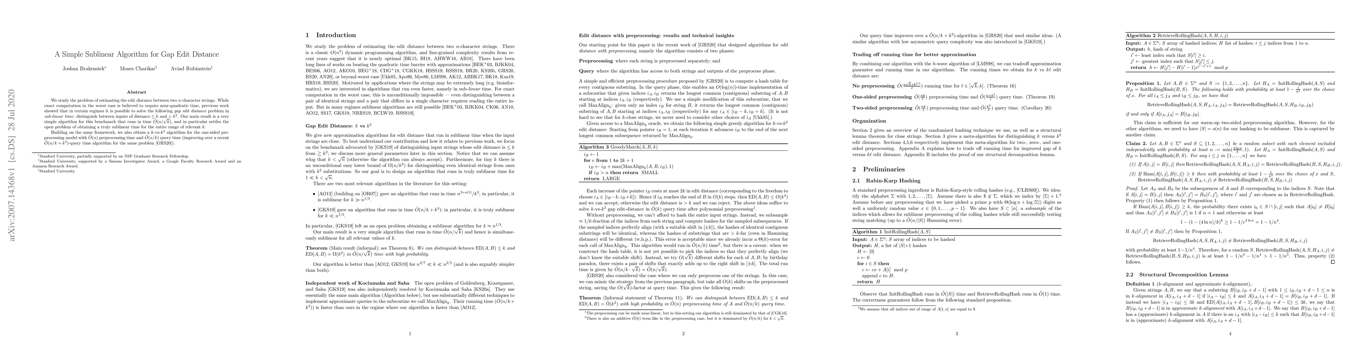 This paper presents a simple sublinear algorithm that estimates the edit distance between two strings, distinguishing between distances ≤k and >k² in time O(n/√k). It also improves the one-sided preprocessing model with reduced preprocessing and query times.