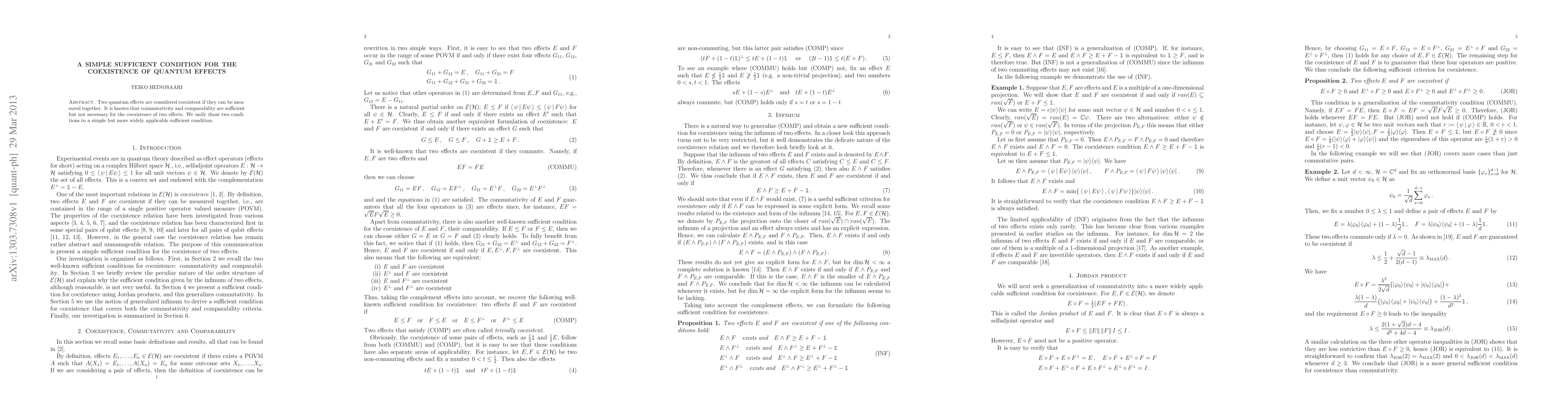 Summary: This paper proposes a unified sufficient condition for the coexistence of quantum effects, combining the previously known conditions of commutativity and comparability into a more broadly applicable criterion. This new condition simplifies the analysis of quantum phenomena.